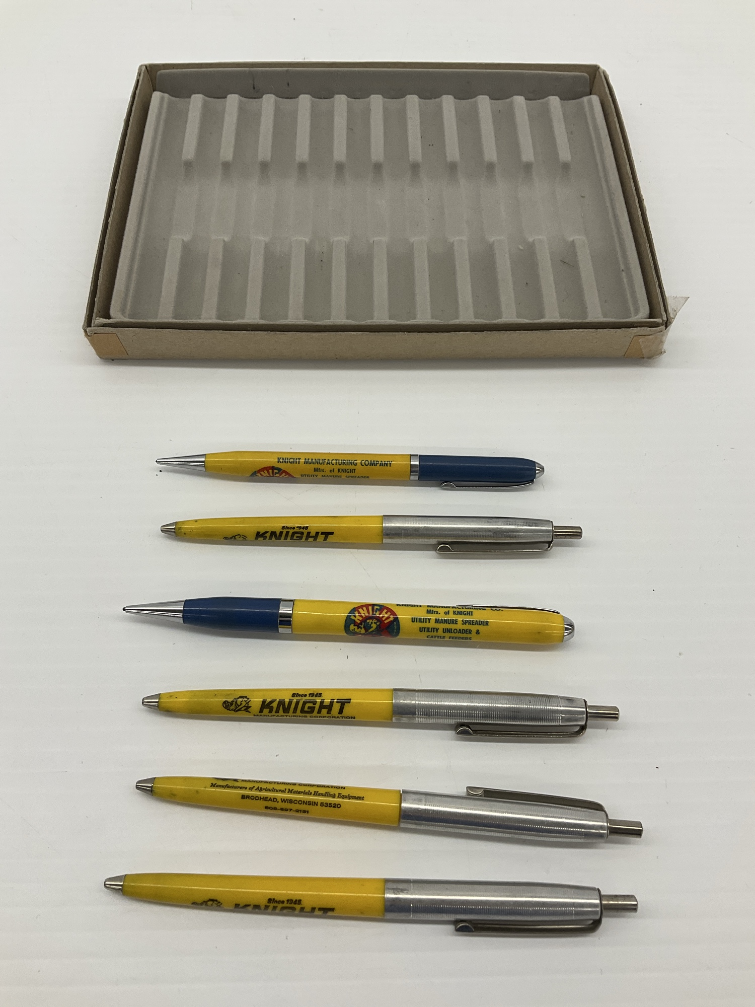 These six Knight Manufacturing Company pens have yellow bodies and silver or blue caps. They feature company logos and product advertising for utility manure spreaders, utility unloaders, and cattle feeders. Some pens have metal or plastic bodies. Pen display included (5.75 x 7.75 in.).