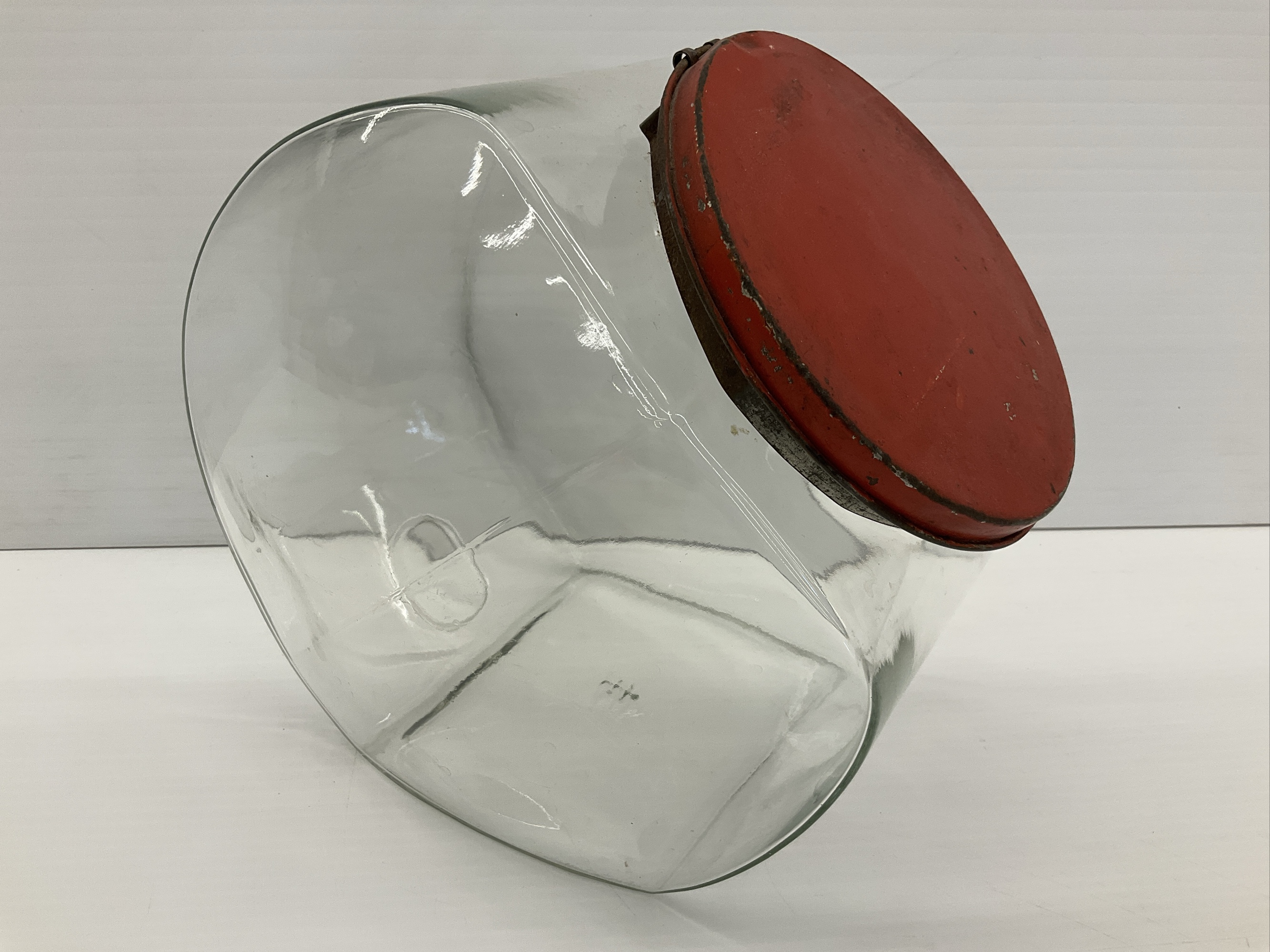 Large glass candy store jar with a metal lid. The jar is clear glass with a square base that curves toward the top, finishing in a round opening. The lid is metal with a red painted band around the bottom edge. There is a marking near the base. 9.75 in. tall