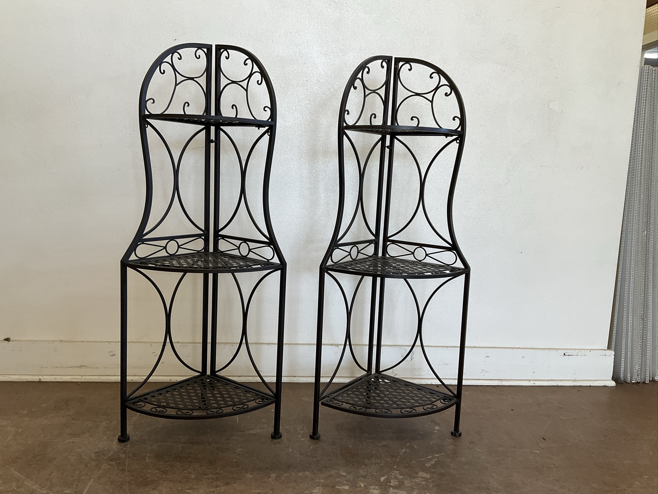Two wrought iron corner shelves featuring three tiers and an ornamental design. Perfect for adding a decorative touch and functional storage to any corner. 45 x 17 x 12 in.