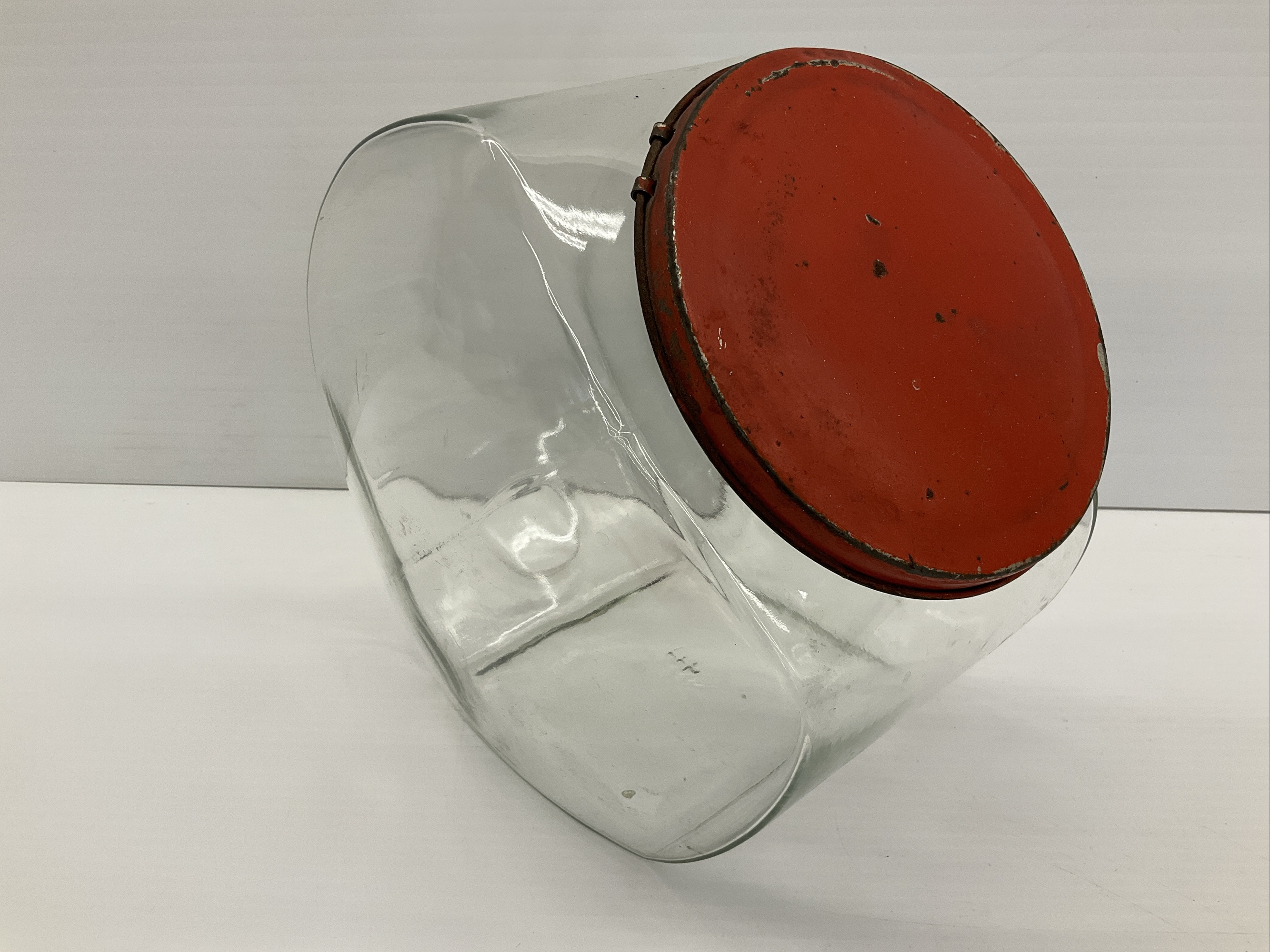 Clear glass store display jar with a red painted metal lid and metal clasp. Great for displaying candy or other items. 9.5 in. tall