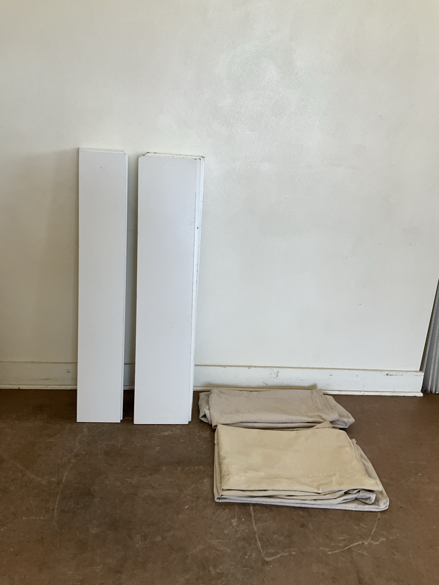 Group of painted wood shelves in assorted sizes. Includes seven pieces that are approximately 1/2 x 8 x 48 in. and seven that are approximately 1/2 x 10 x 48 in.