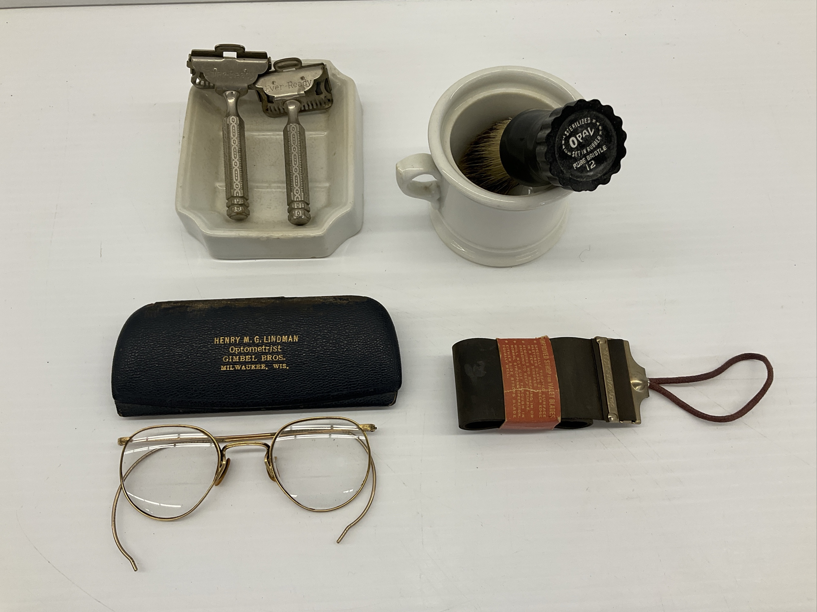 Collection including two Ever-Ready razors in an ironstone soap dish marked Knowels, Taylor and Knowles, a shaving mug marked QMD with an Opal shaving brush, an eyeglasses case from Henry M. G. Lindman Optometrist Gimbel Bros Milwaukee, Wis., eyeglasses, and an improved strop for valet blades.
