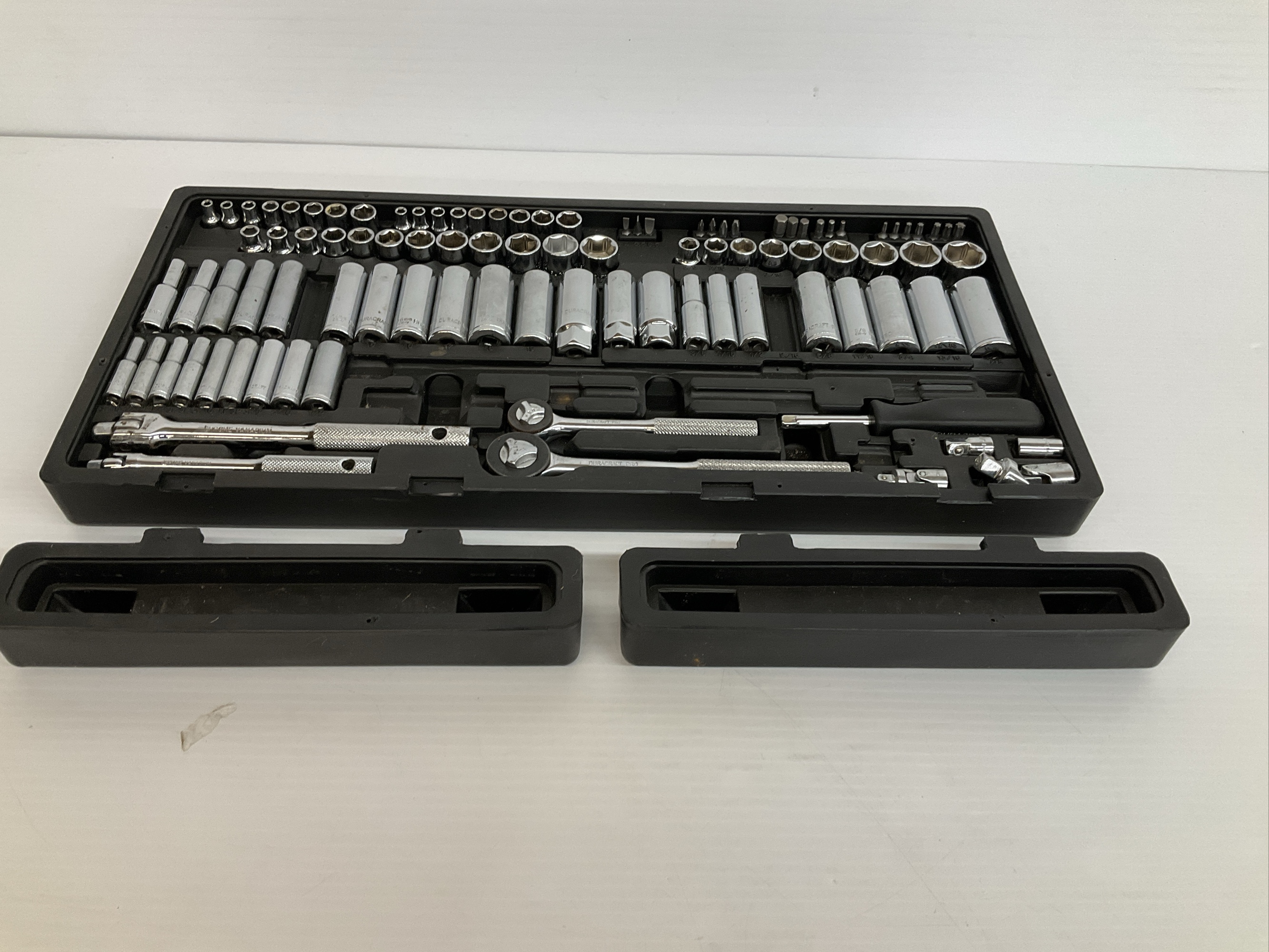 Duracraft Pro socket set with various sockets and wrenches, all neatly organized in a fitted case.