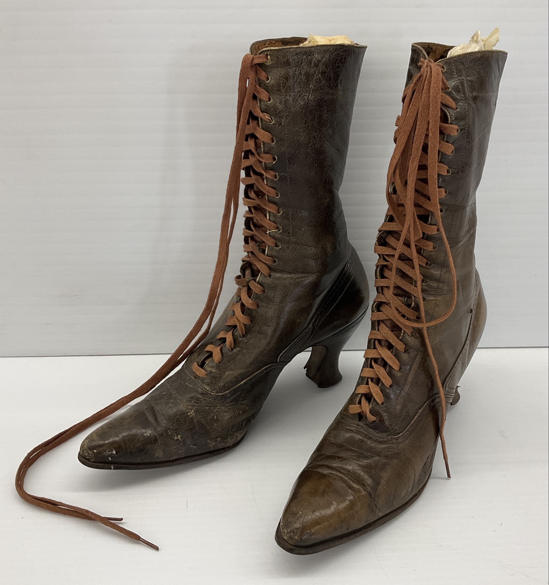 Pair of lace-up, pointed-toe, leather women's boots. Brown lace. Note the writing on the inside lining and wear on the heels.