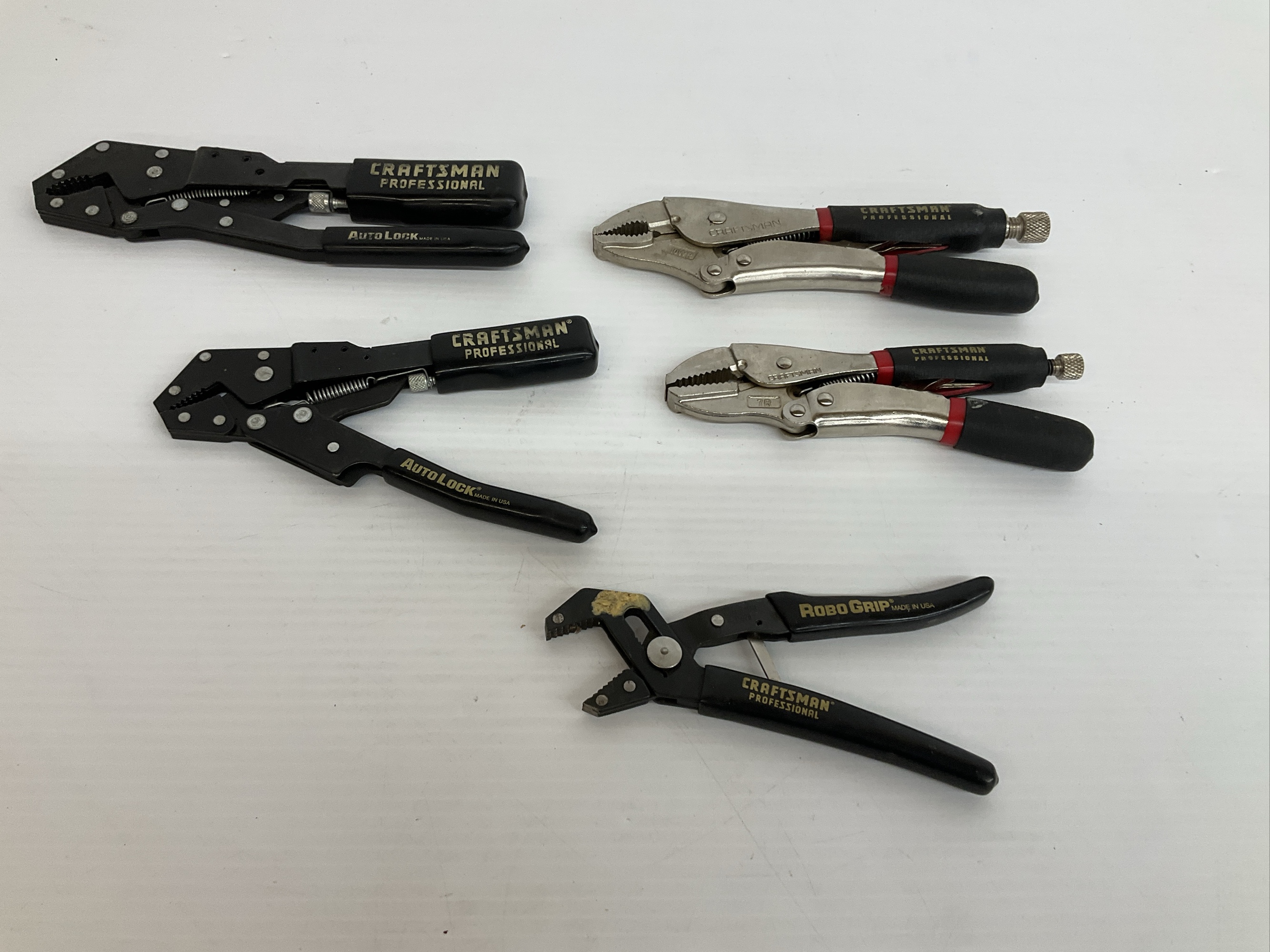 This lot includes several pairs of Craftsman Professional locking pliers. There are Craftsman Auto Lock pliers, Robo Grip pliers, and other variations as shown in the images.