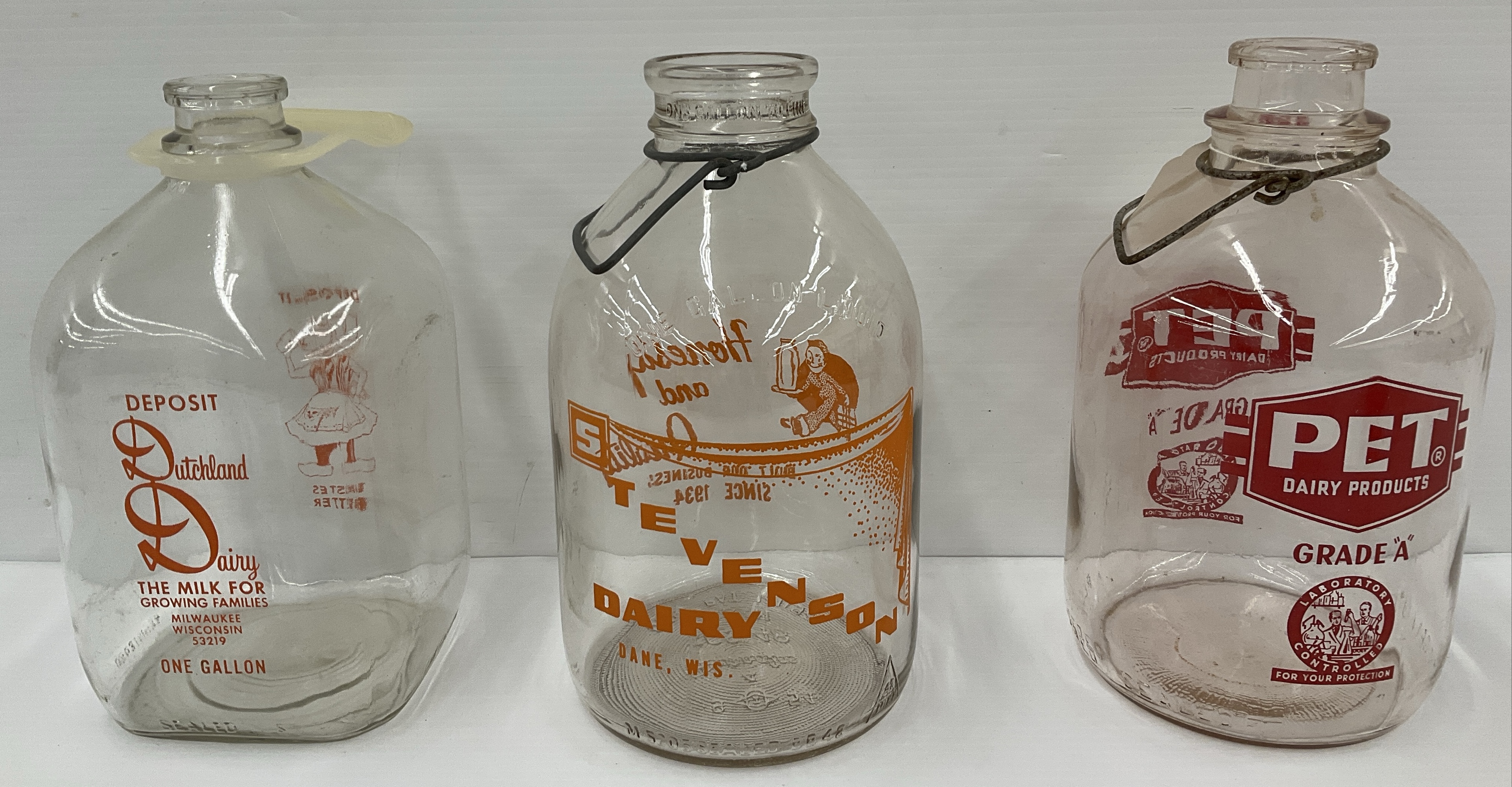 Three Vintage One Gallon Dairy Milk Bottles: Dutchland, Stevenson, and Pet