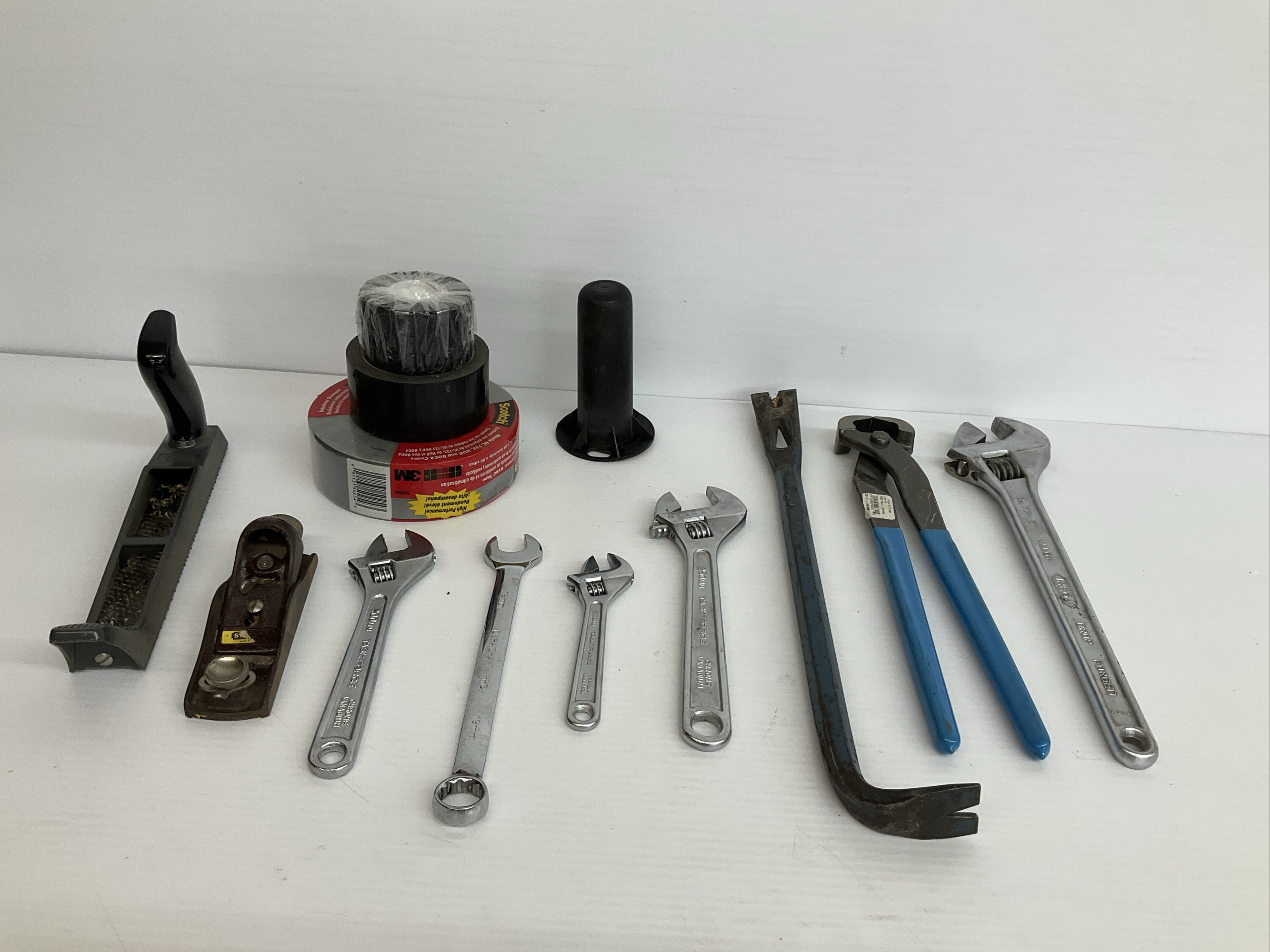 This lot features a variety of hand tools including adjustable wrenches, wood planes, a crowbar, wire cutters, and duct tape.