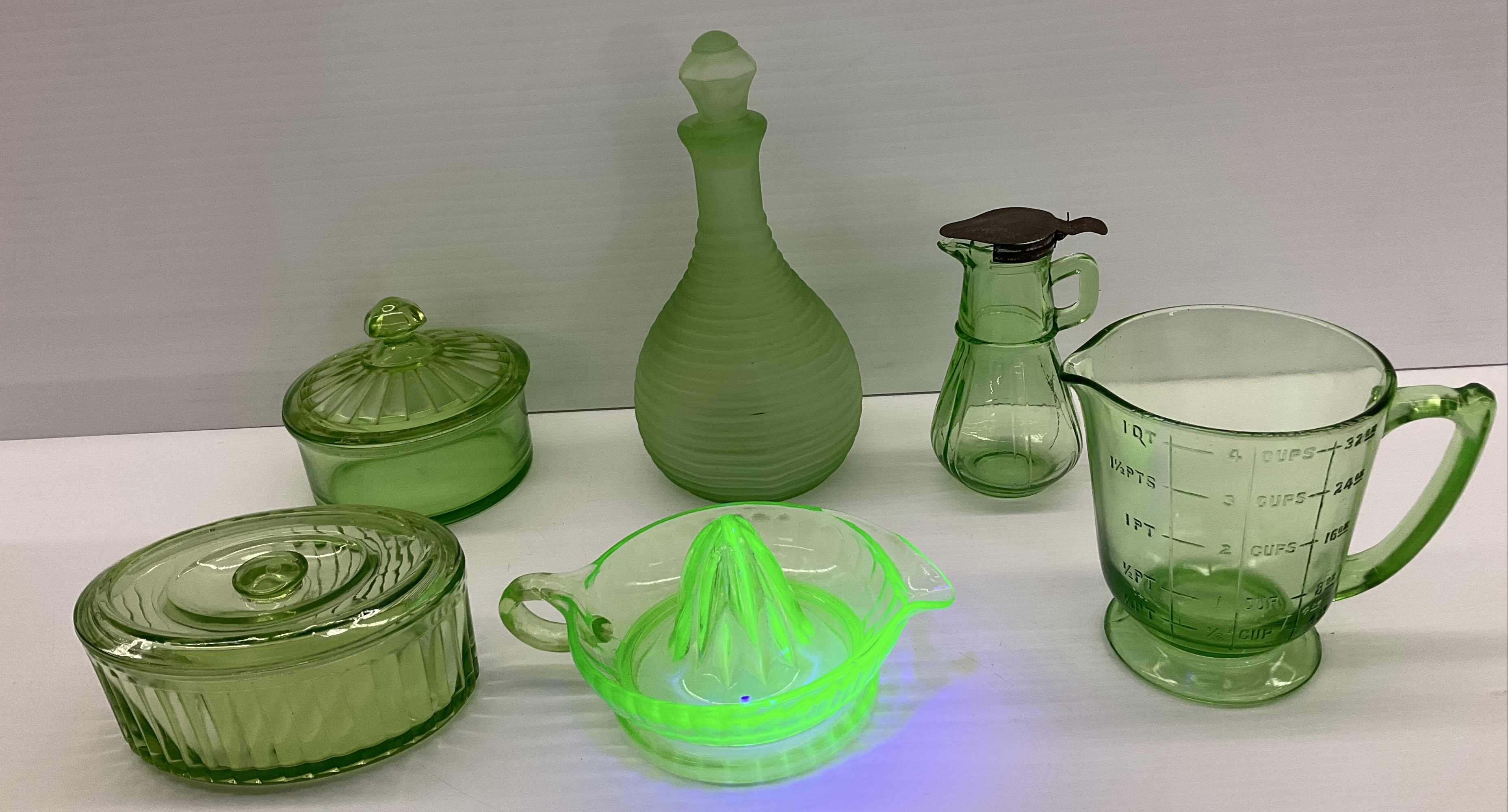 Uranium Glass Decanter, Juicer, Measuring Cup, and More