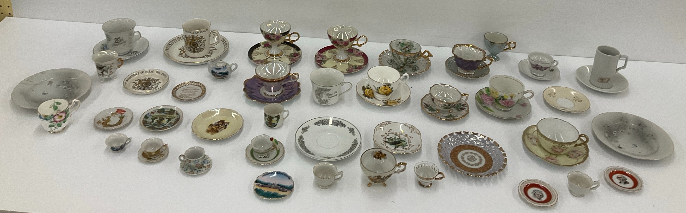This lot features a variety of decorative plates, cups, and saucers. Some are marked UCAGCO China Made in Occupied Japan, Trimmont Ware Japan, Lipper & Mann Creations Japan, and Product of Stafford Japan. Largest plate 7 in. dia.