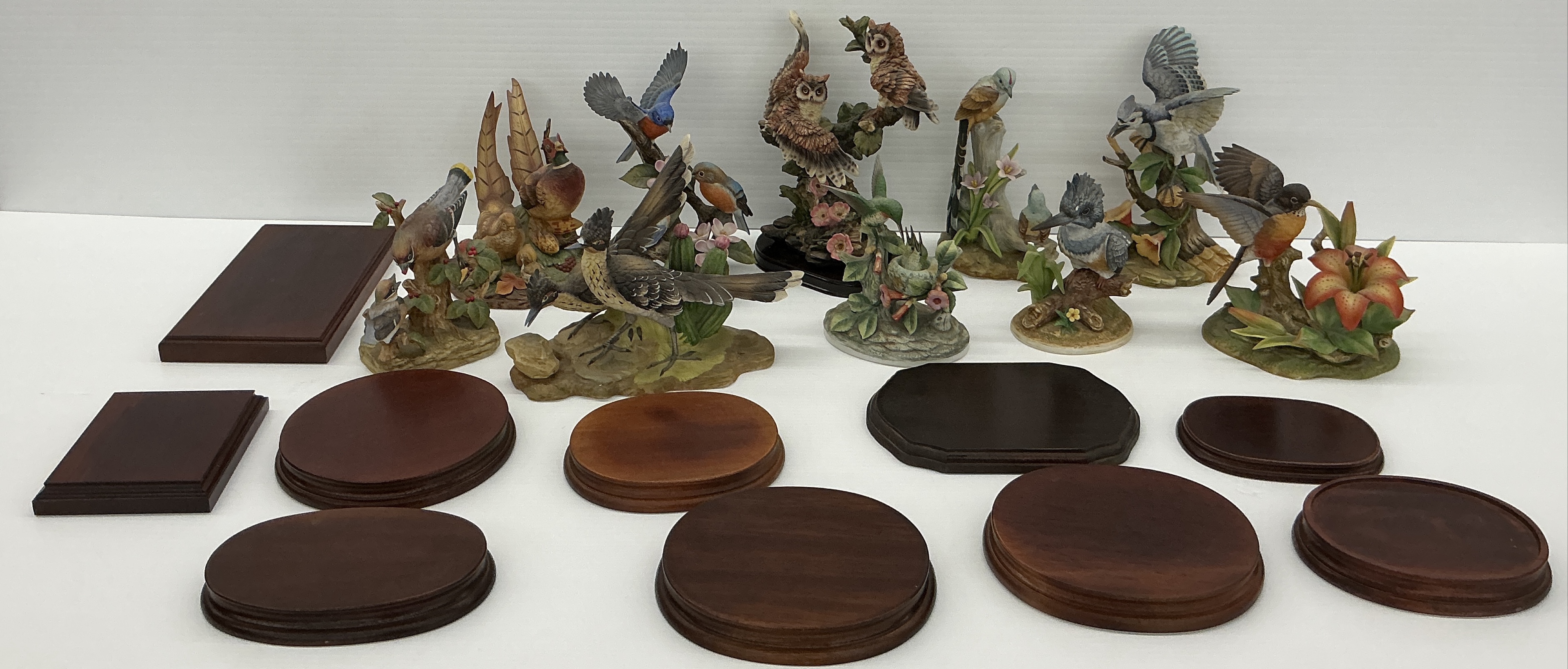 Collection of Andrea by Sadek porcelain bird figurines, including Cedar Waxwing (9199), Roadrunners (5747), Owls (damaged), Blue Jays, Pheasants and more. Also included are wooden stands. Tallest 11.5 in.
