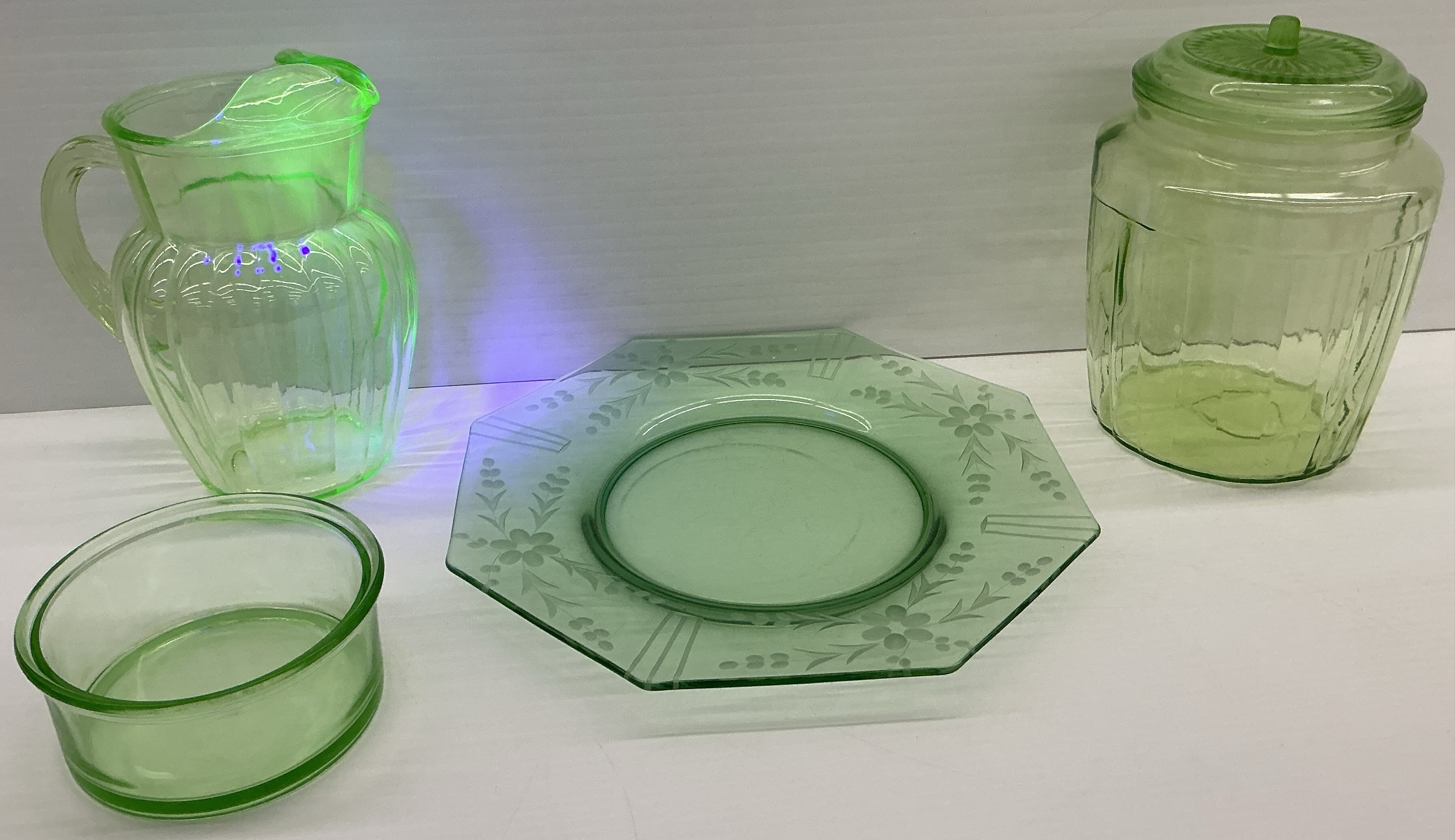 A collection of green depression glass pieces including a pitcher, jar with lid, a plate with floral design, and a small bowl. Three glow under UV light. Tallest 9.75 in.