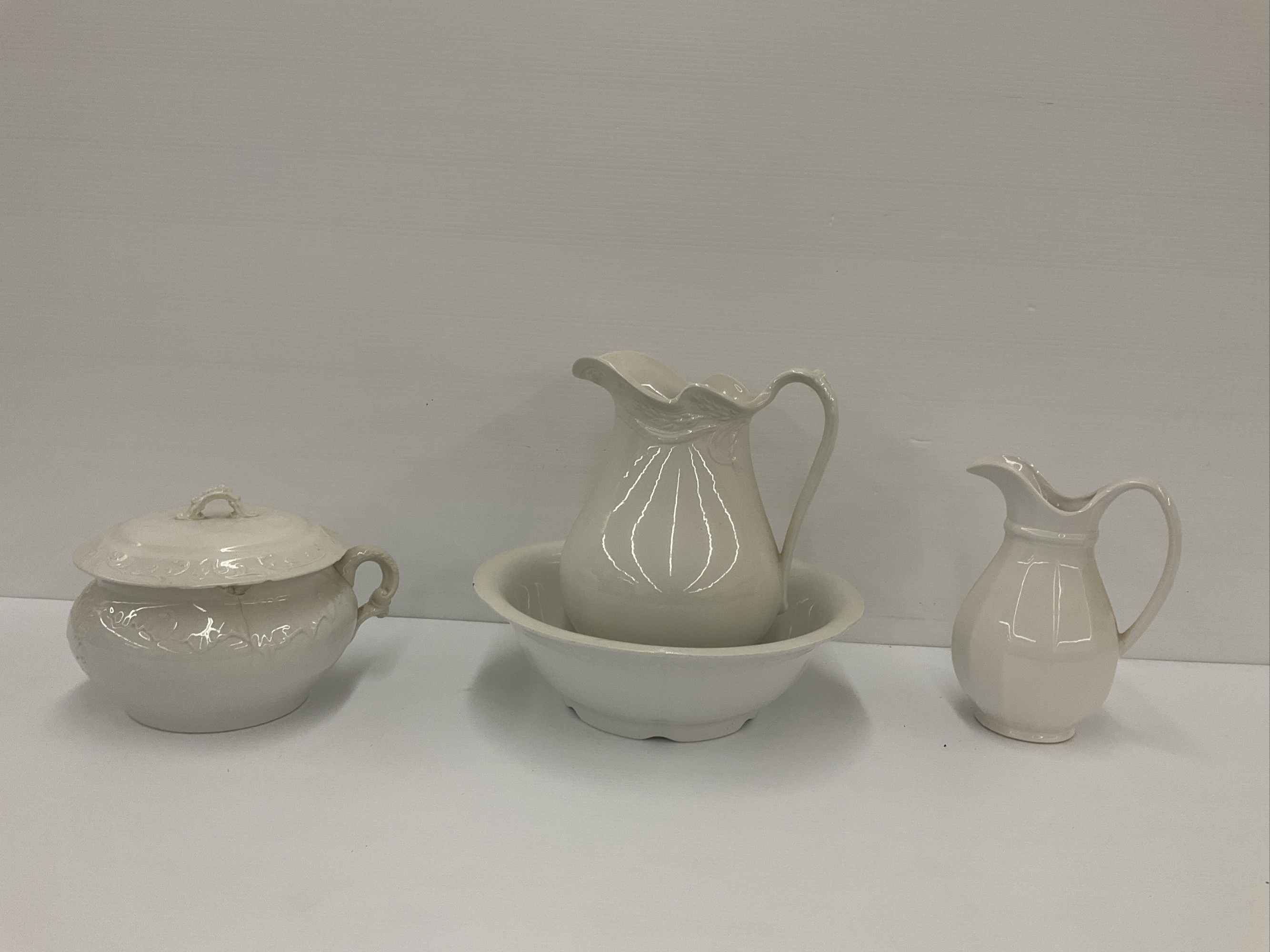 Ceramic Pitchers, Wash Basin and Chamber Pot... some chips
