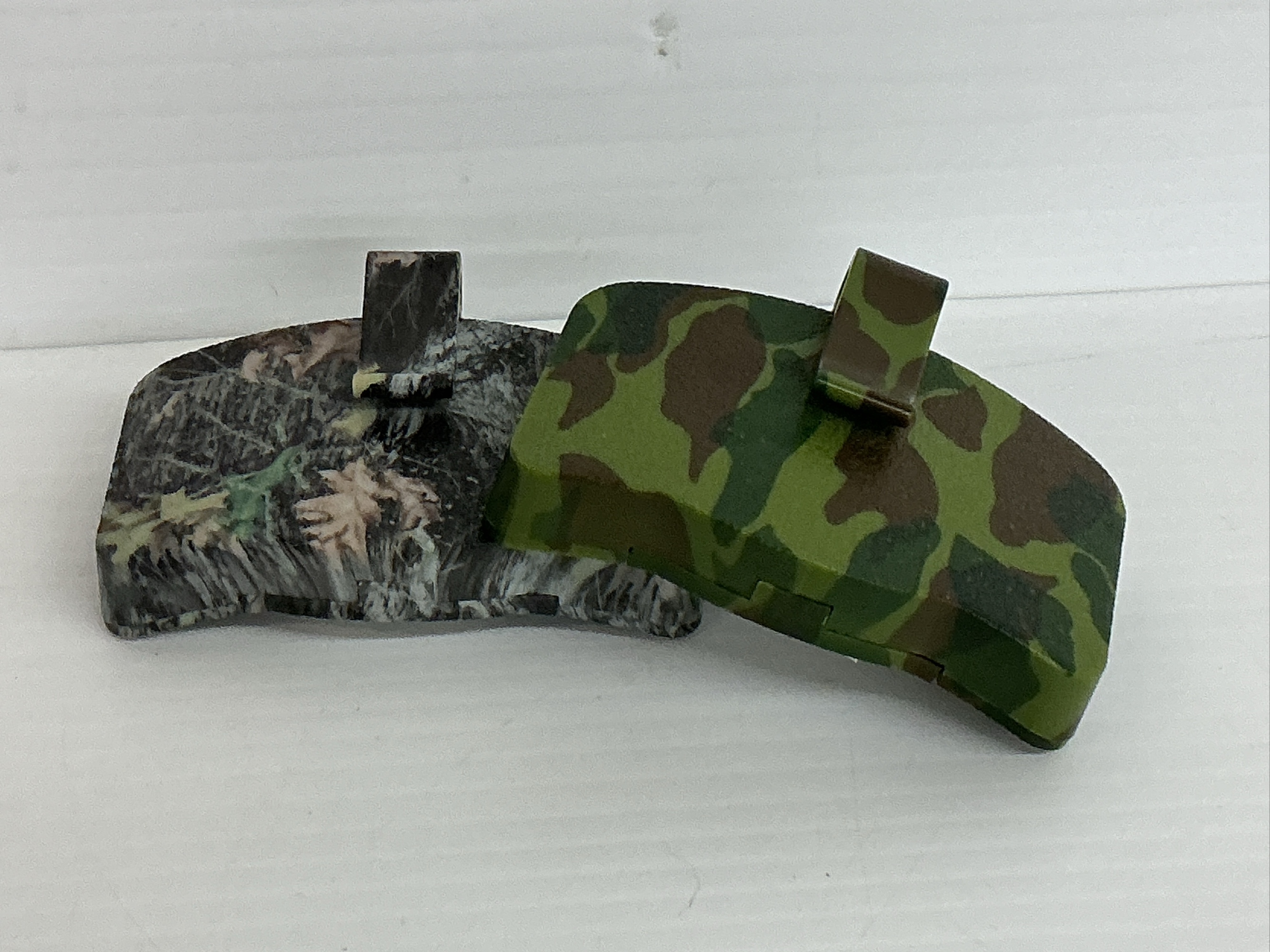 This lot features two clip-on headlights. Both headlights have an LED light and feature a camouflage pattern. One is a traditional green and brown camouflage, while the other is a gray and tan camouflage. 1.5 x 4 x 2.5 in.