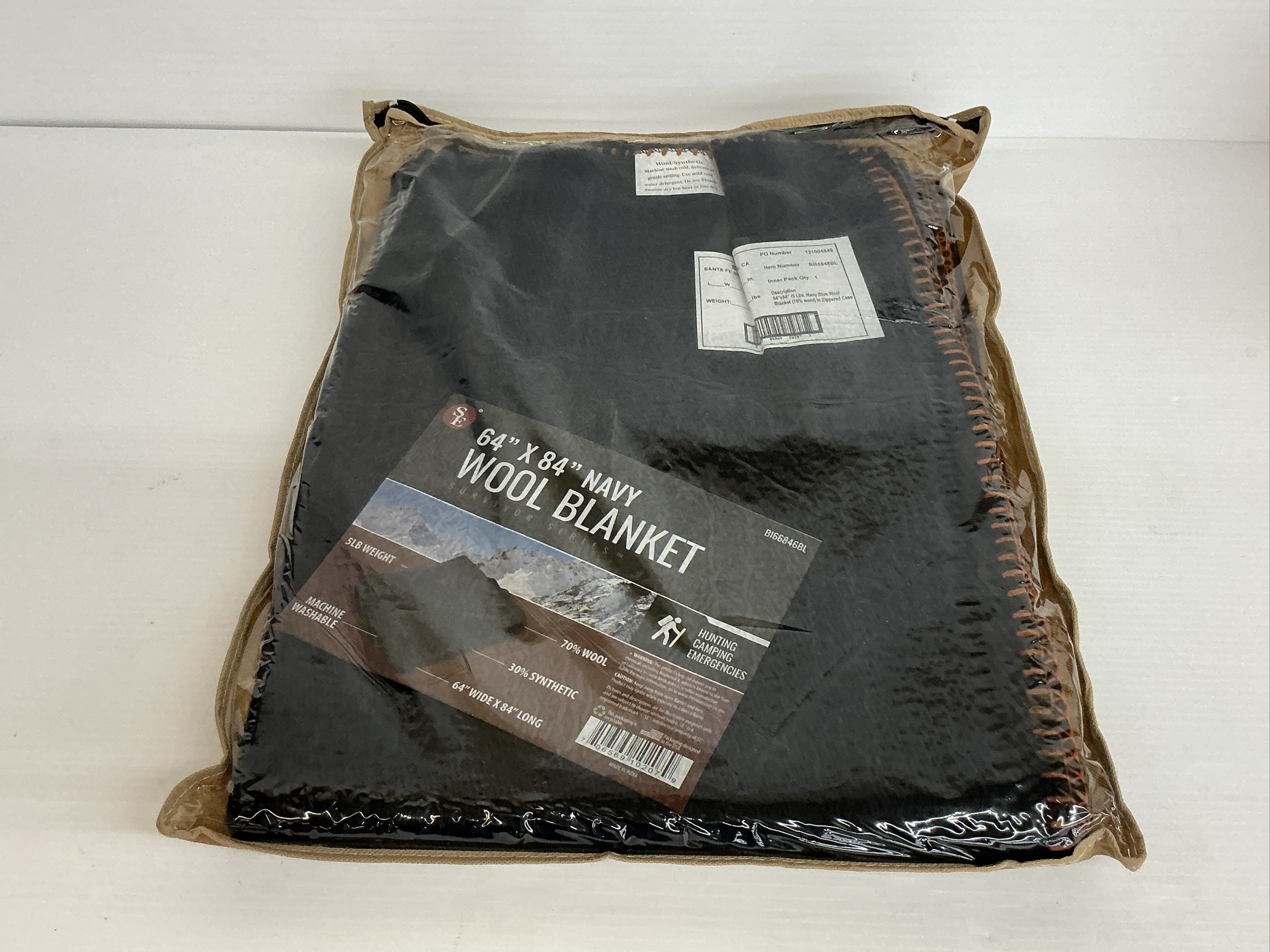 Survivor Series navy color wool blanket measuring 64 x 84 in. New in bag, this blanket is 70% wool and 30% synthetic. It weighs 5 lbs. and is machine washable.