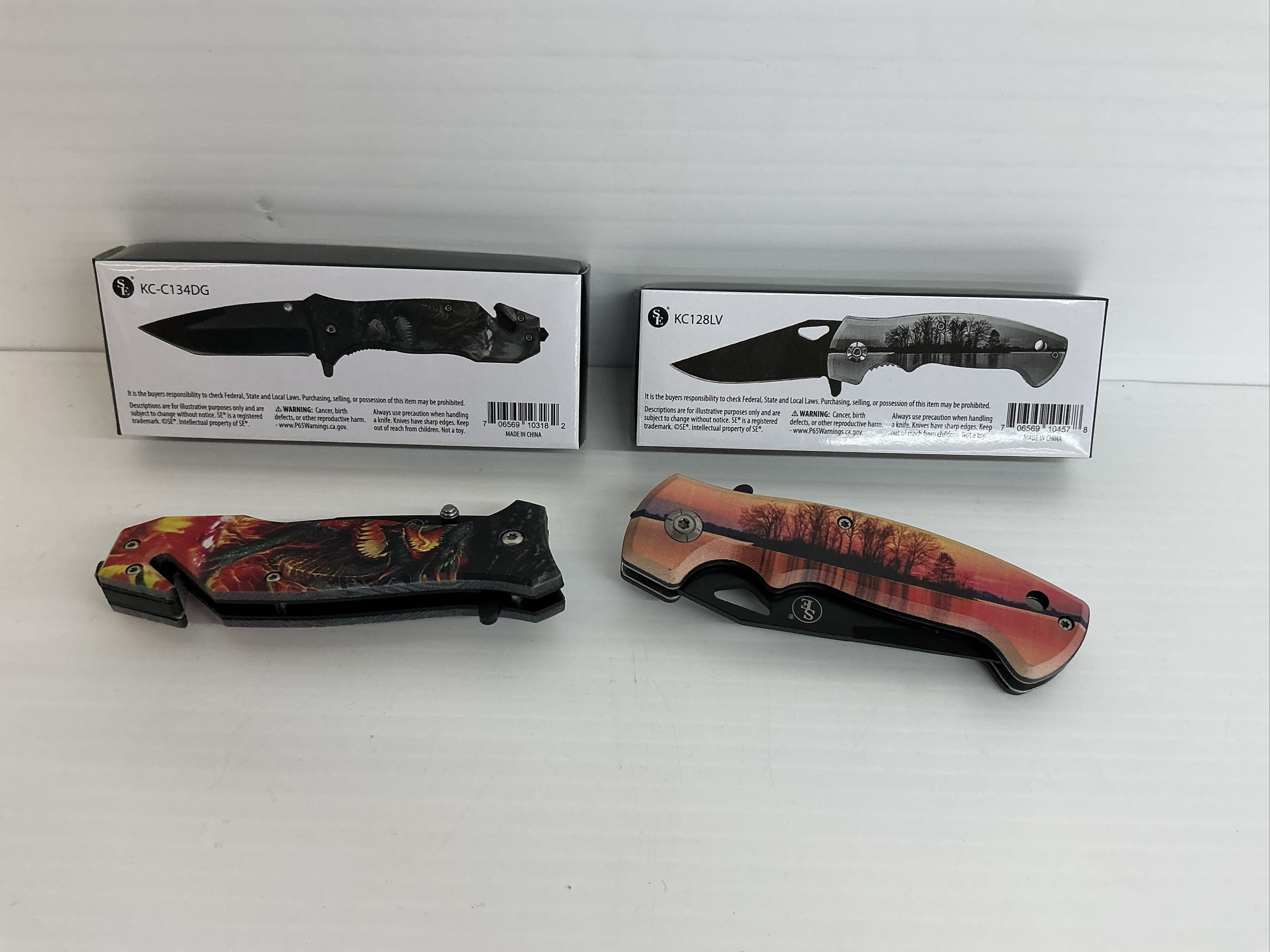 You are bidding on a lot of two folding pocket knives. Includes one KC128LV knife with a scenic handle design and one KC-C134DG knife with a phoenix design. These are new in box.