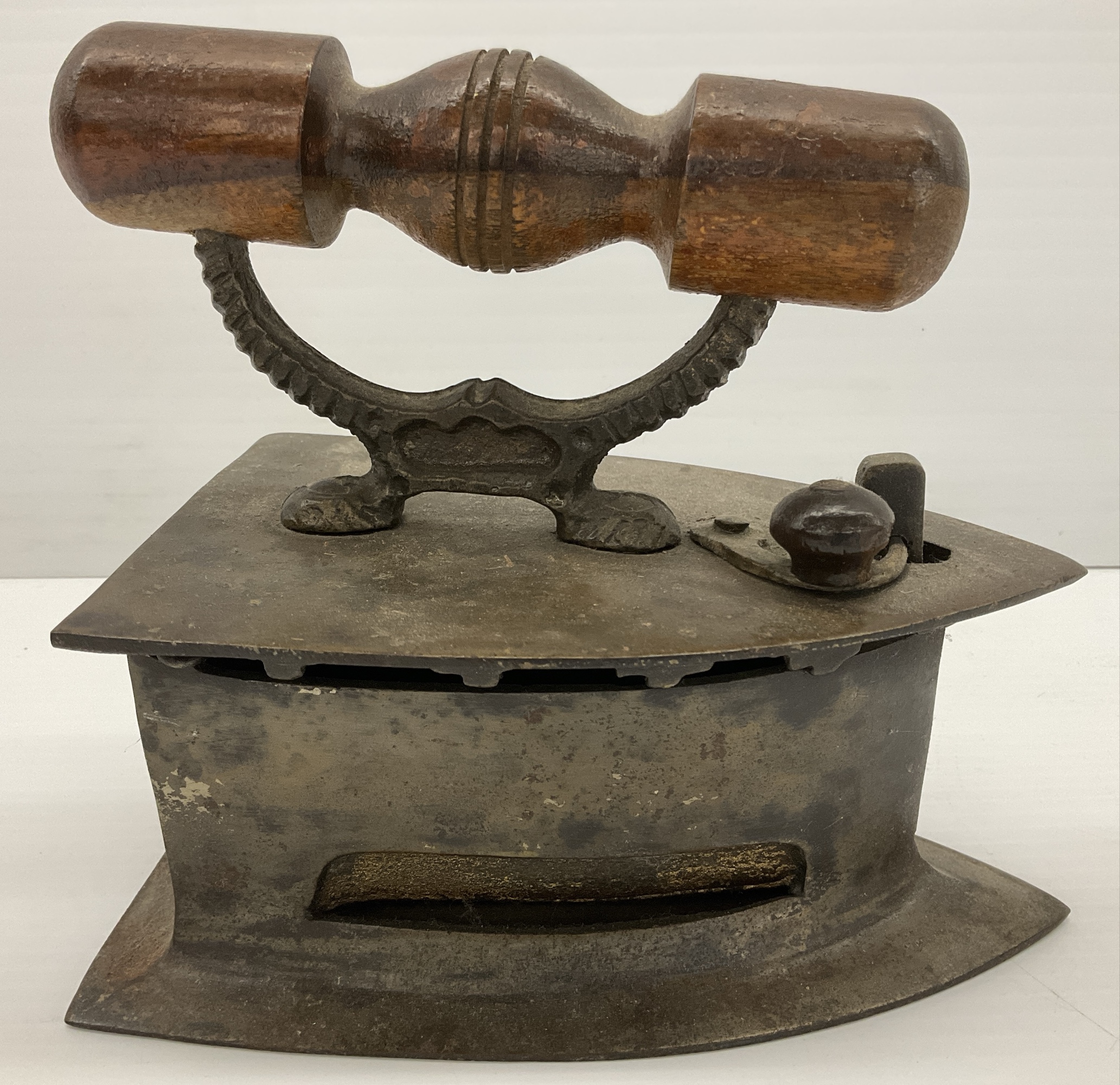 Here is a cast iron sadiron featuring a wooden handle. It would have been heated with hot metal billets inserted into the back opening. 7.25 in. tall