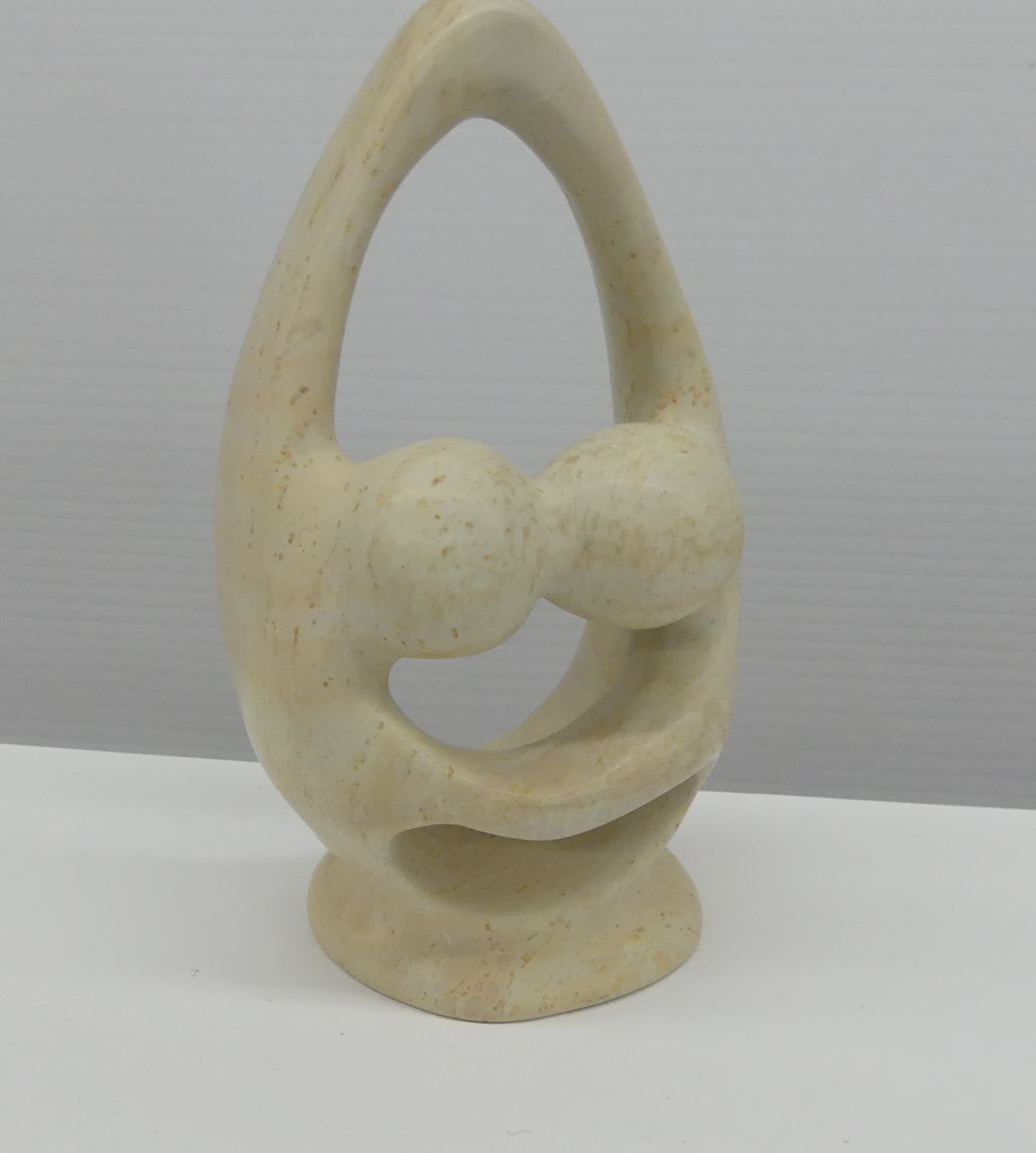 This is a unique abstract stone sculpture depicting a mother and child. The sculpture is made of a light-colored stone with subtle variations in tone. It measures approximately 6 inches tall.