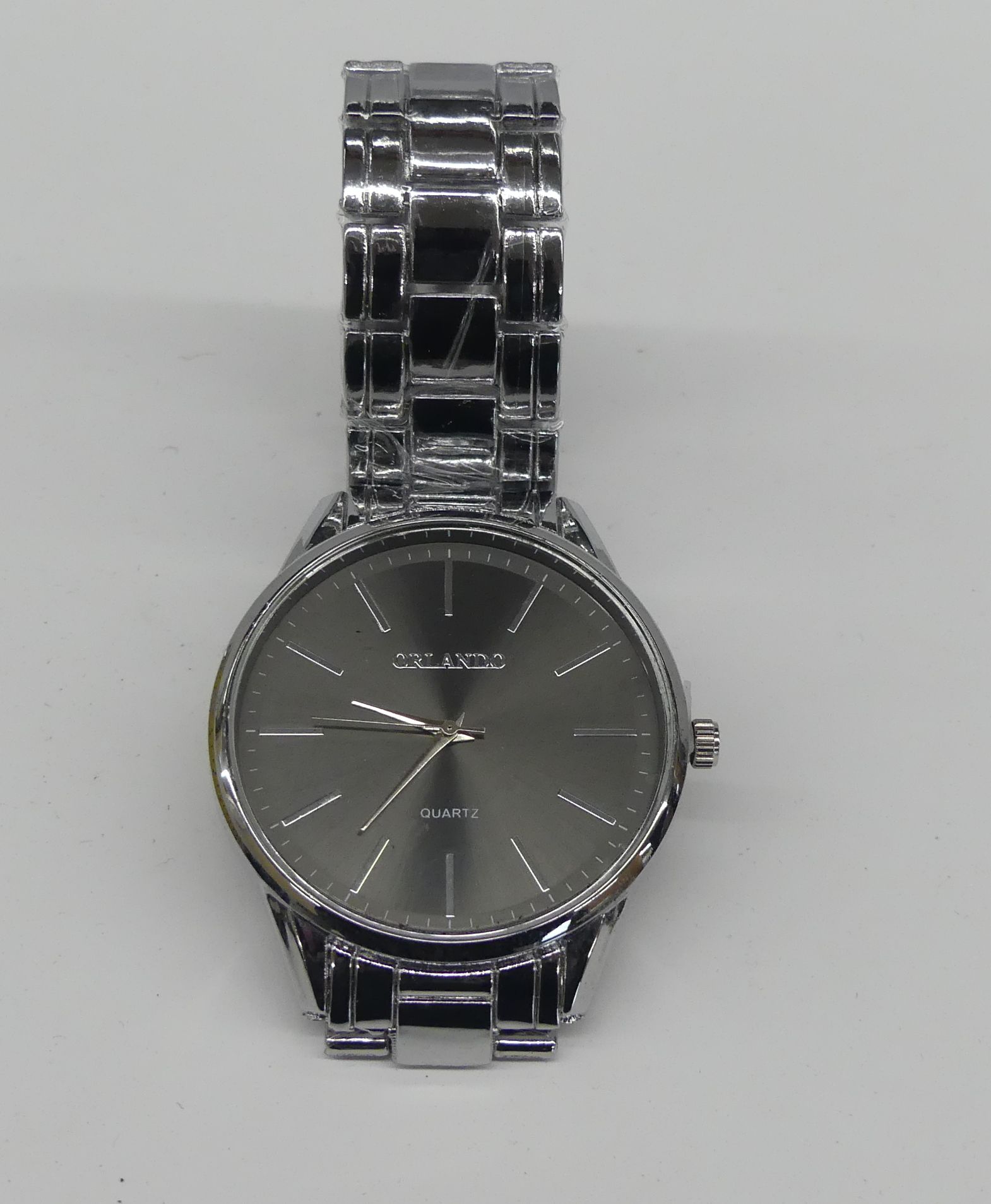 This is an Orlando quartz watch featuring a silver-tone metal band. The watch has a simple, classic face. Case size is approximately 1.75 inches.