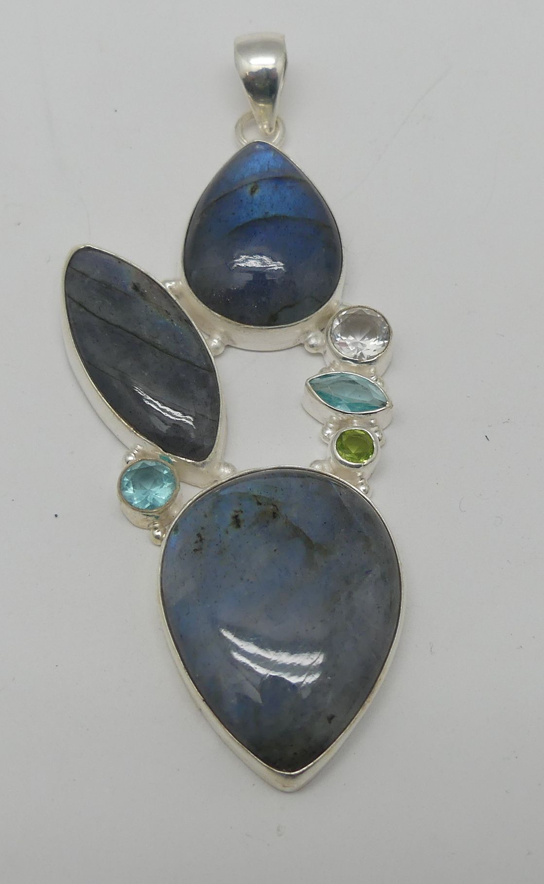 Sterling silver pendant featuring multiple labradorite stones of various shapes, accented by small gemstones.