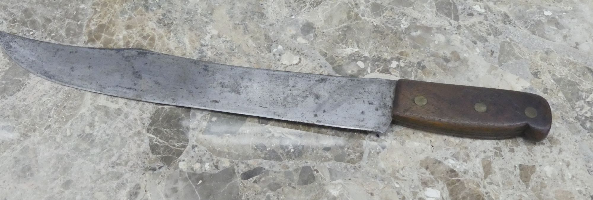This listing is for a large carbon steel blade knife, featuring a wooden handle secured with three rivets. The blade has a noticeable curve, and the knife has an overall length of 13 in.