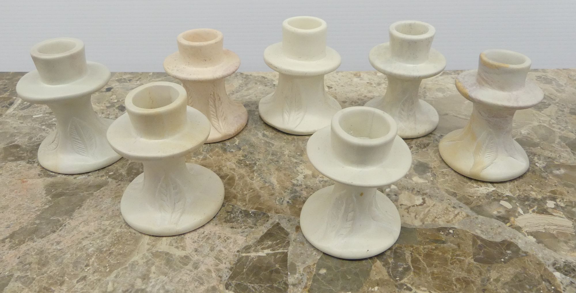 Set of seven stone candle holders, each featuring a pedestal base and a lipped top. Approximately 4 in. tall.