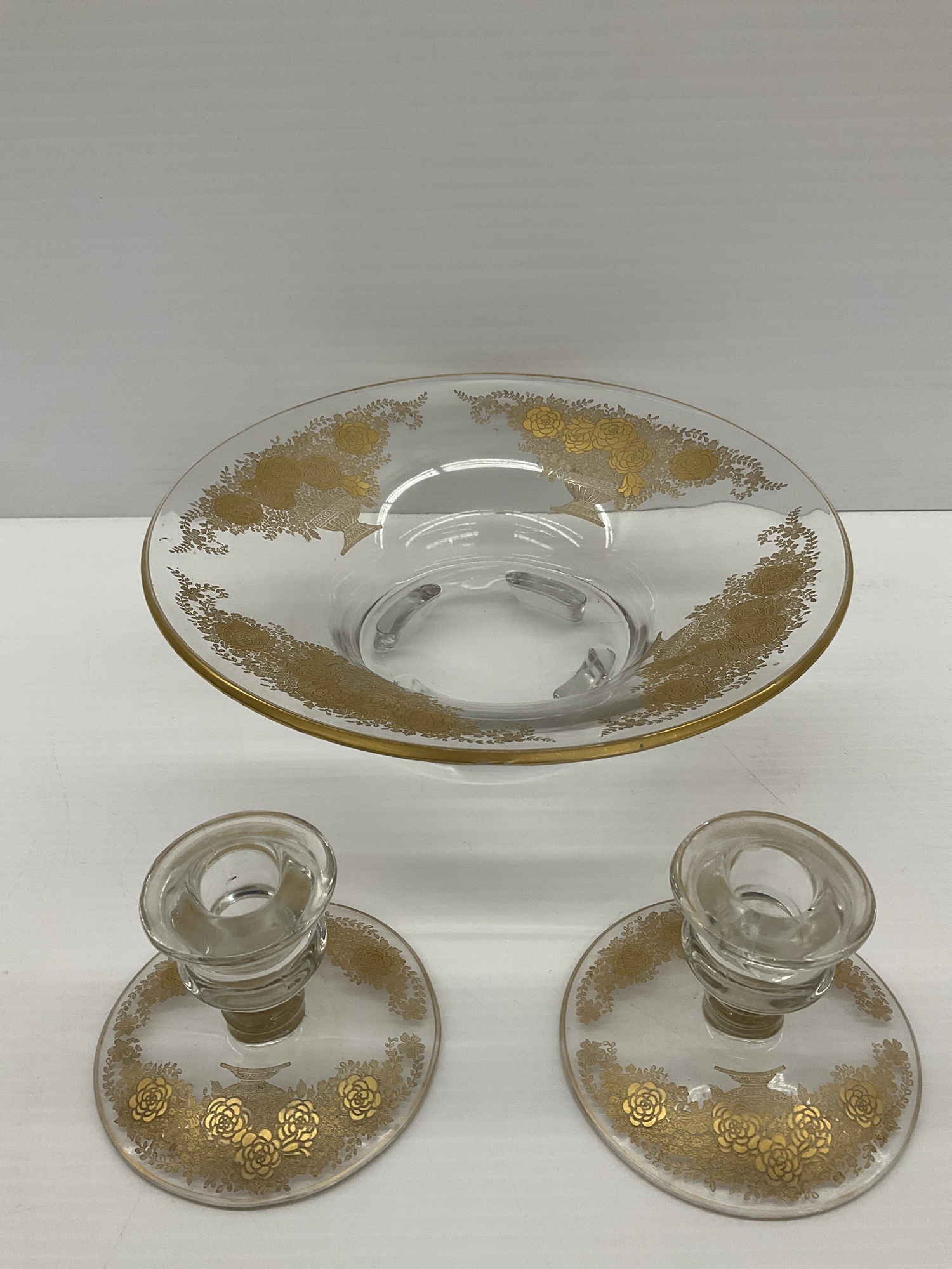 Vintage Glass Console Bowl and Candle Holders with Gold Floral Design