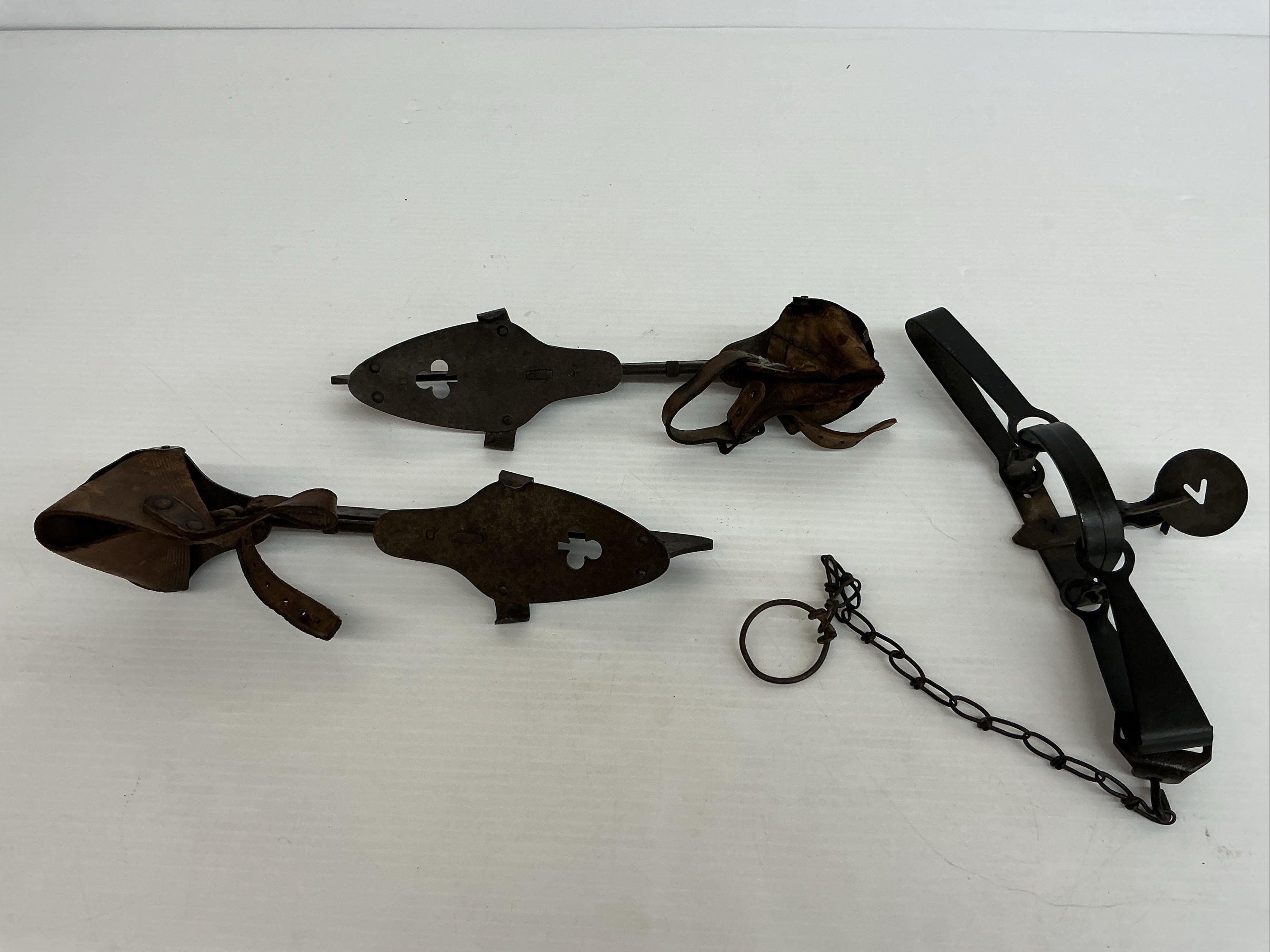 Vintage Animal Trap and Pair of Ice Skates w/Leather Straps