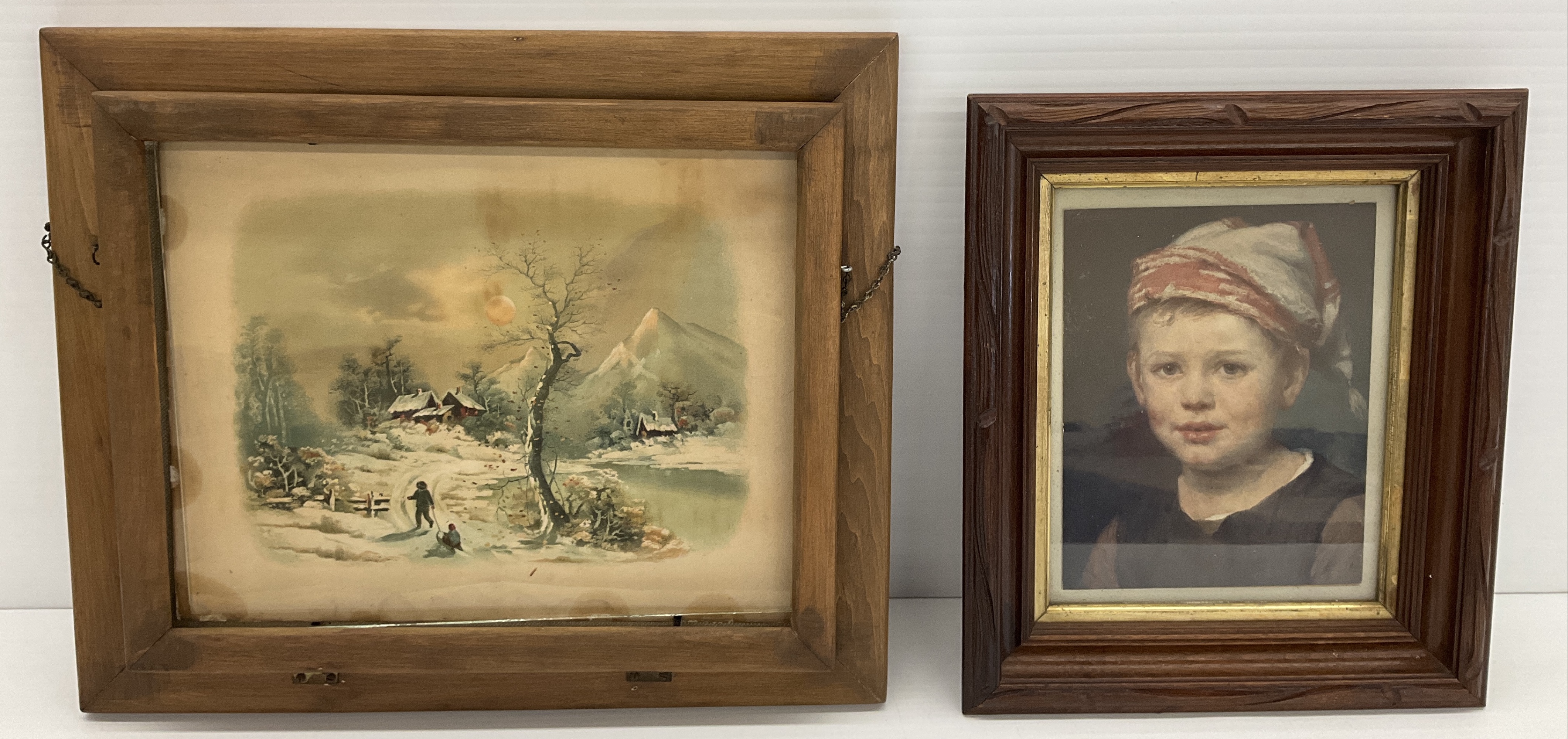 Antique wall hanging magazine rack features a winter landscape scene (needs restoration) and a portrait print of a child. Largest 15.25 x 18.25 in.
