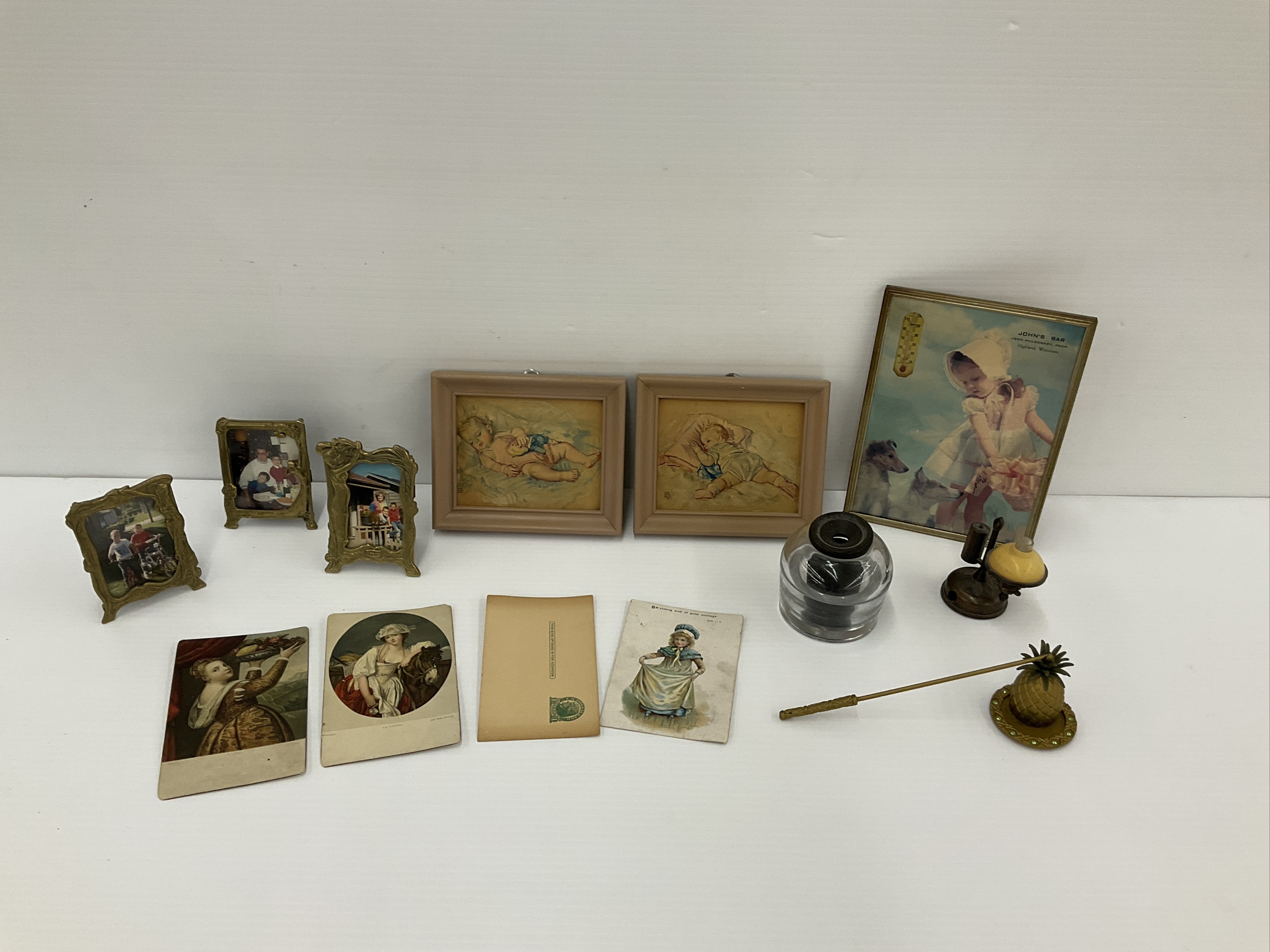 Here's a group with framed art pieces, vintage advertising thermometer from John's Bar Highland Wisconsin, postcards, various photo frames, a vintage ink well, a novelty pencil sharpener and a pineapple candle snuffer. Largest 8.5 x 6.5 in.