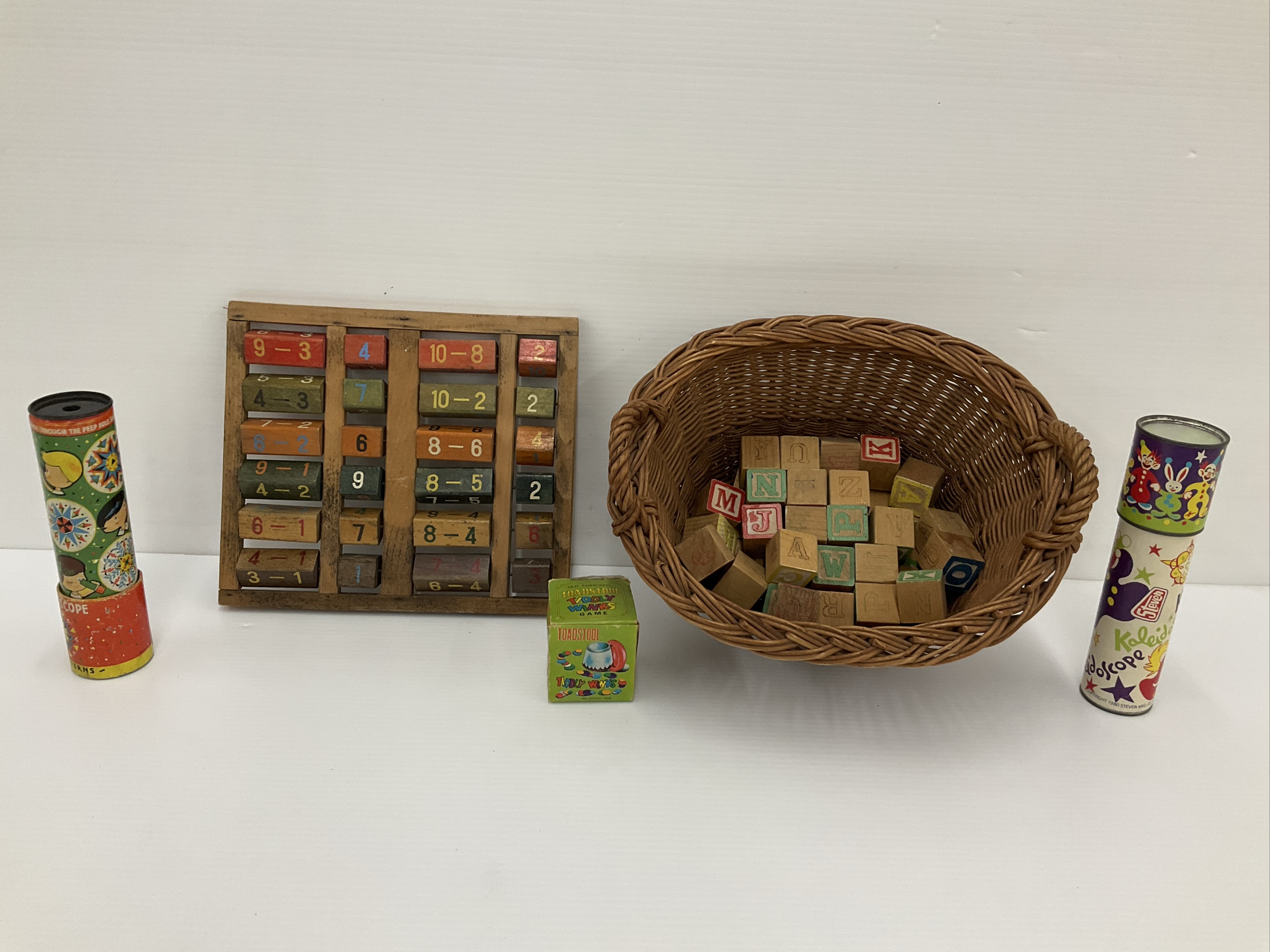 Vintage Educational Toys: Blocks, Math Toy, Kaleidoscopes, Toadstool Game
