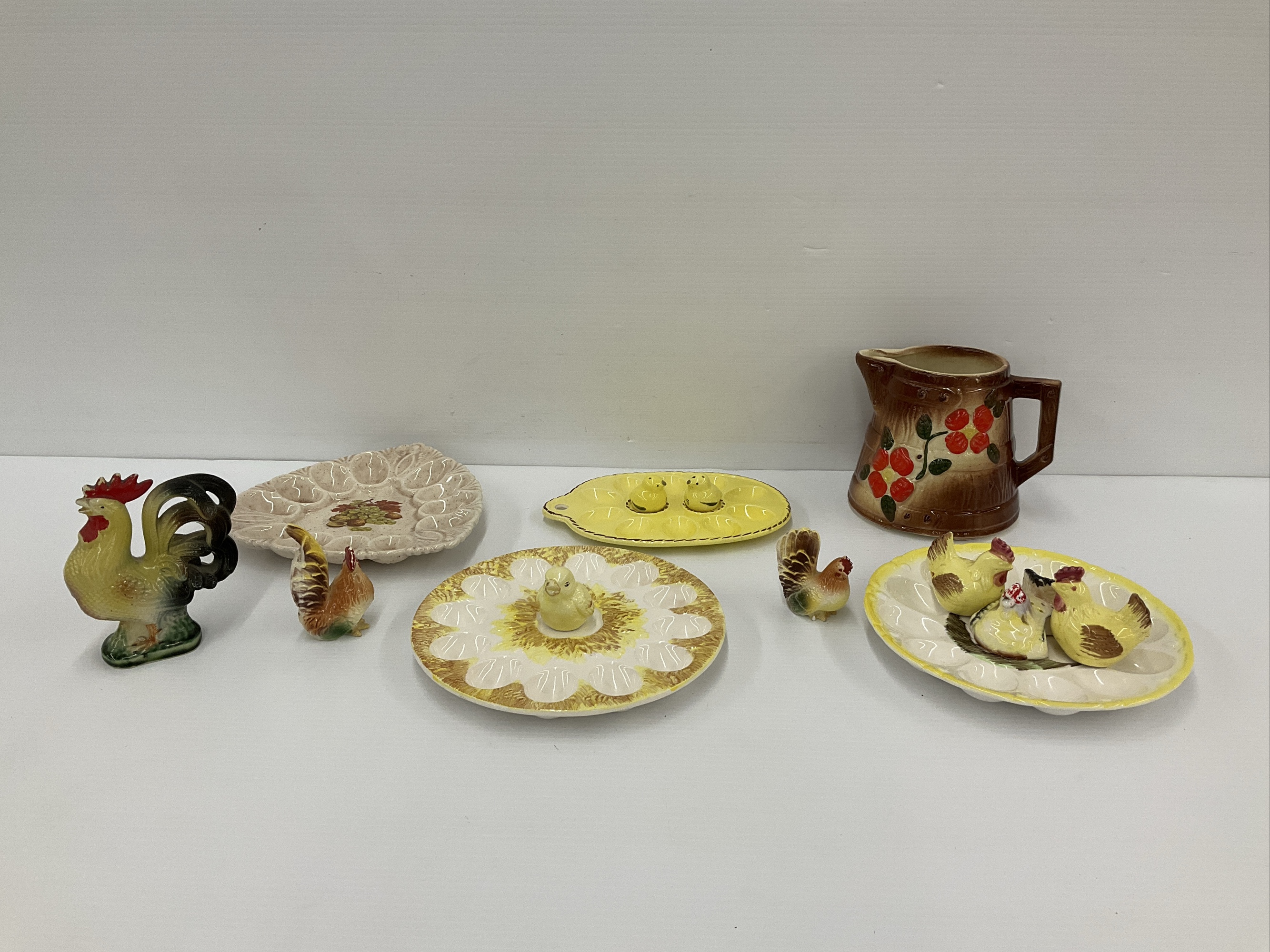 Ceramic Pitcher, Egg Dishes, and Chicken Figurines Collection