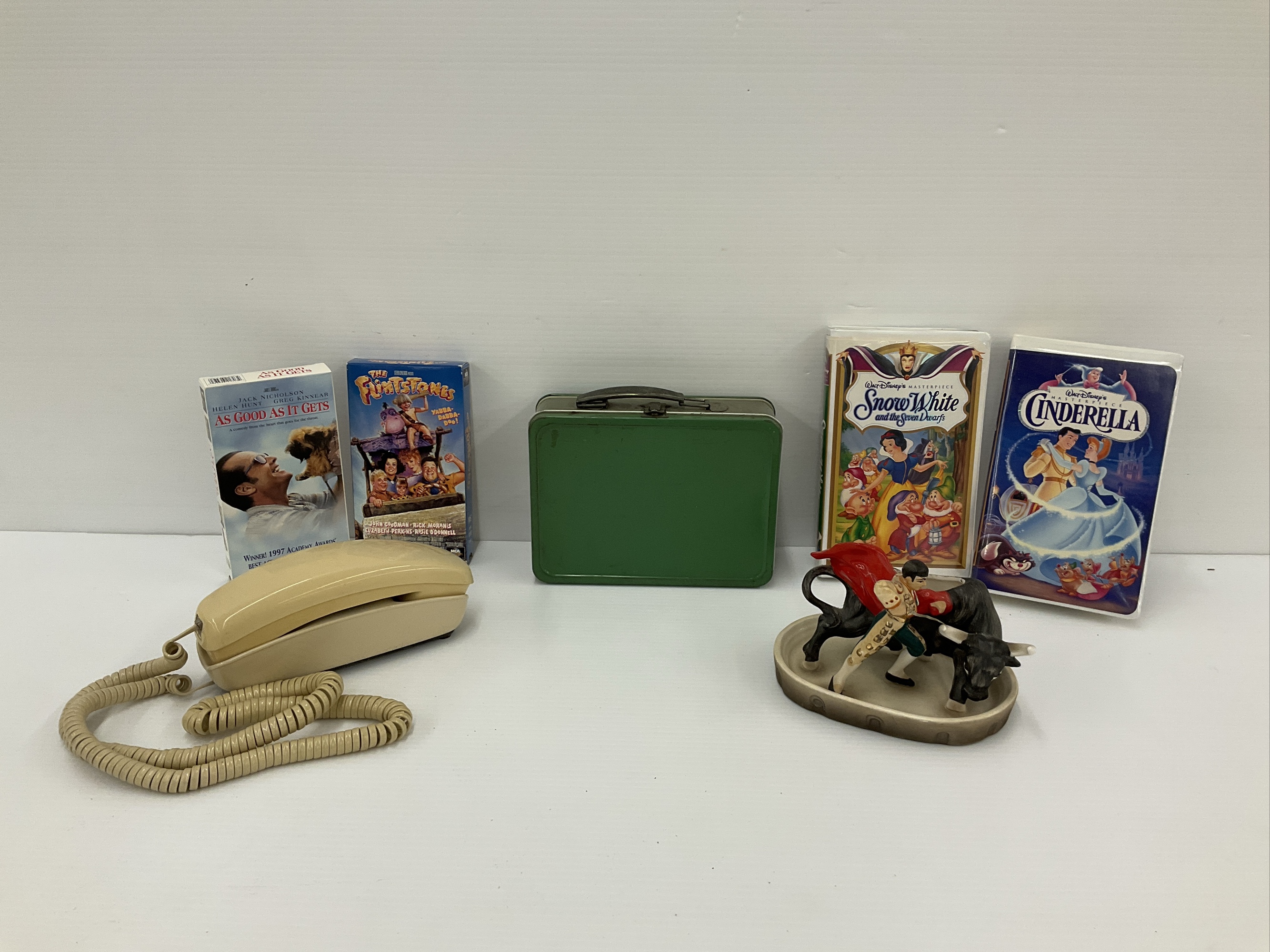 This lot includes a bullfighter figurine from Japan, a selection of VHS tapes (As Good As It Gets, The Flintstones, Snow White, Cinderella), a rotary telephone, and a metal tin with sewing and craft supplies.
