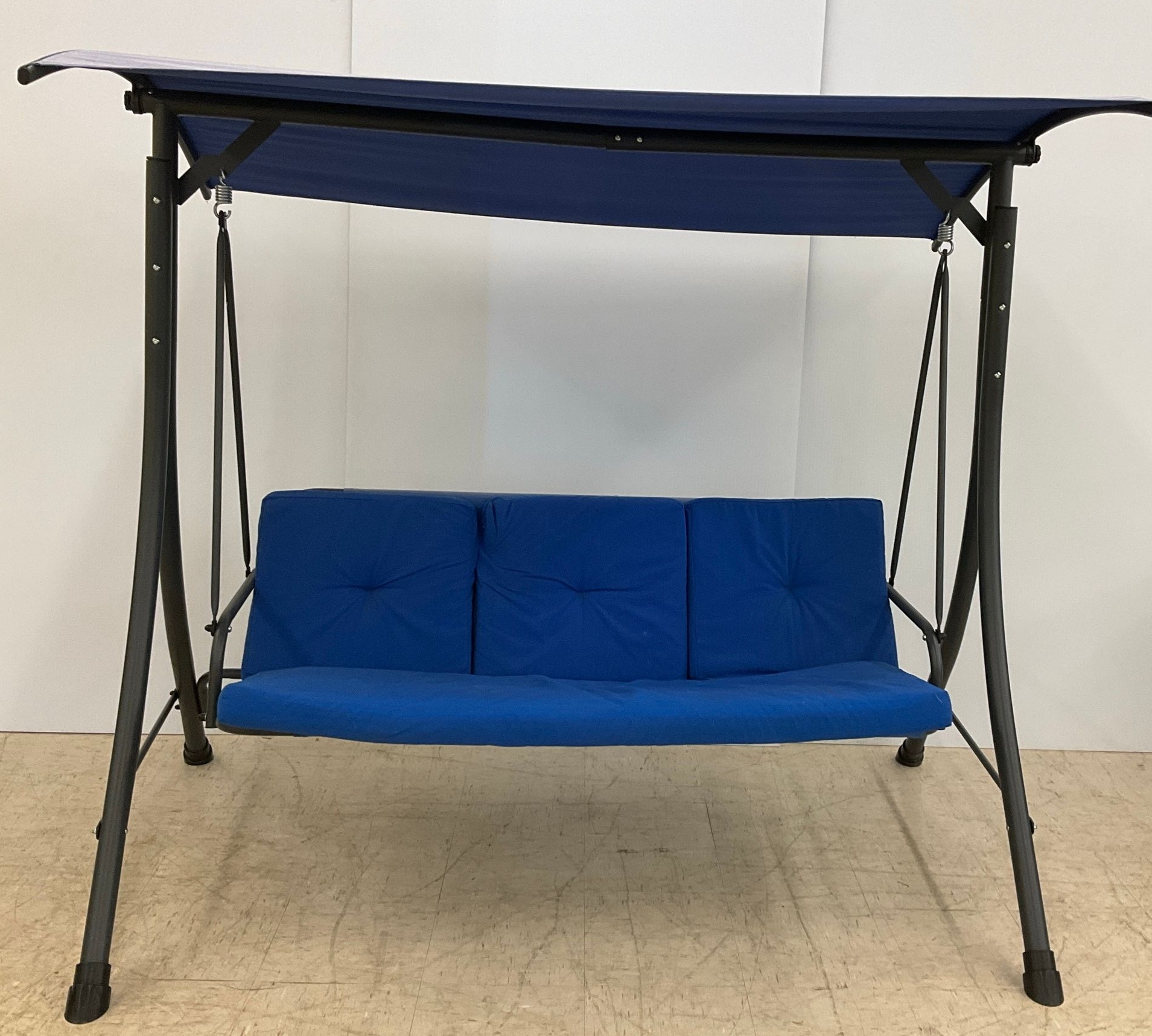Enjoy the outdoors with this patio swing, featuring a comfortable blue cushion and a canopy to provide shade. Perfect for relaxing in your backyard or garden. 65 x 75 x 48 in.