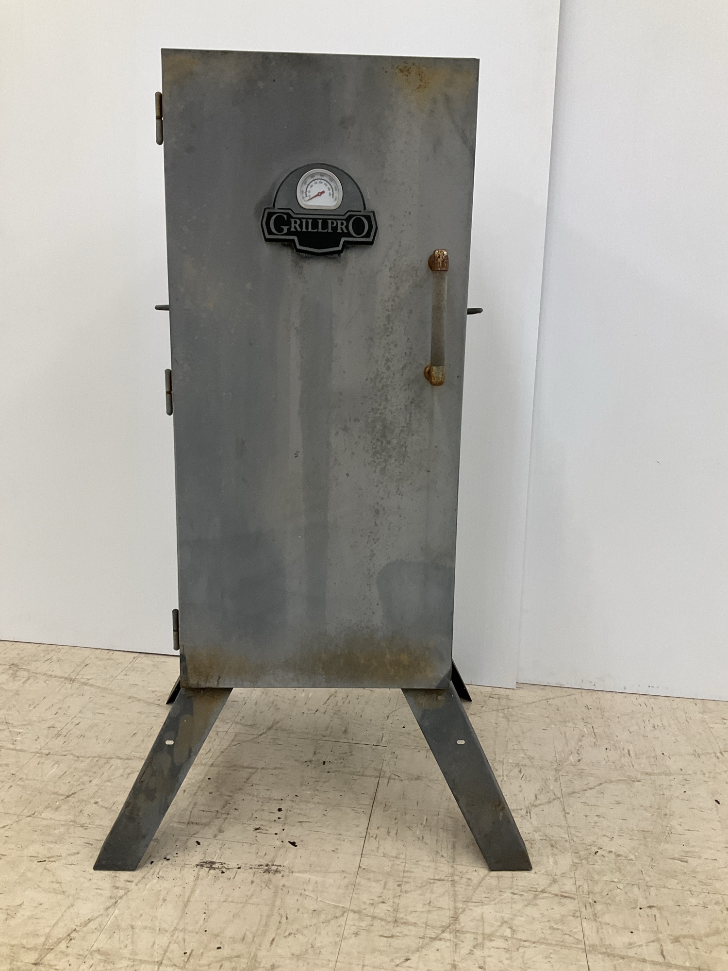 Up for auction is a GrillPro charcoal smoker. It features a built-in thermometer, a vertical design, an access door, and multiple interior racks. 43 x 24 x 21 in.
