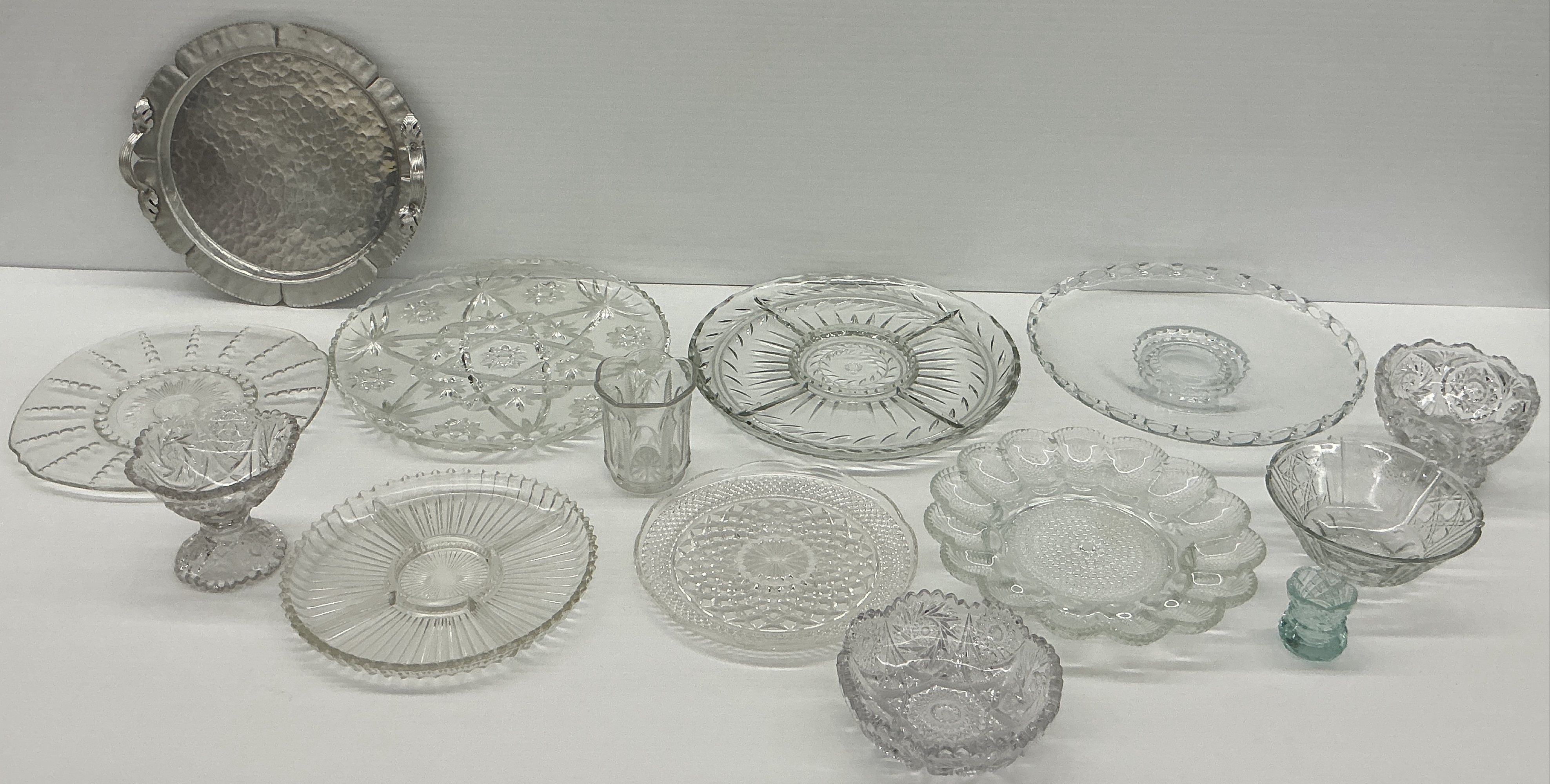 Collection of various glass serving dishes including bowls, plates, platters, a glass, an egg plate, a toothpick holder and a hammered aluminum tray. Largest 13.5 in. dia.
