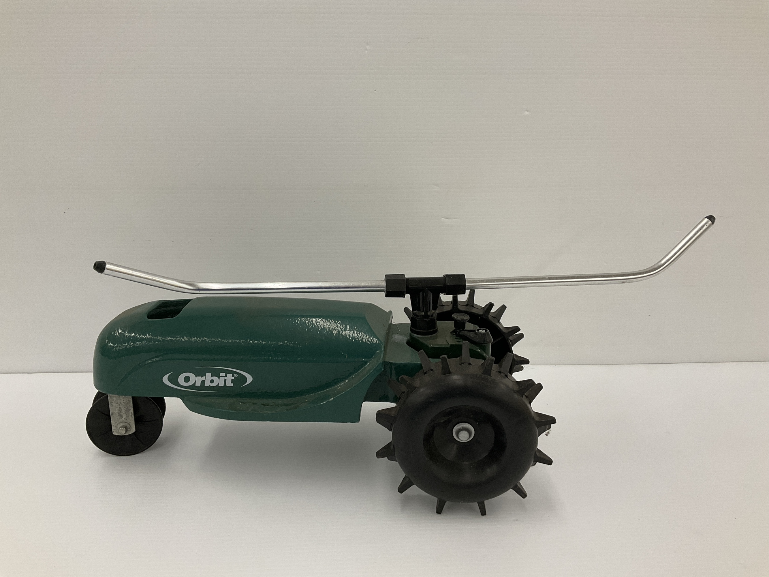 This is a green Orbit traveling sprinkler that's designed to look like a tractor. It has a metal spray bar and black wheels. It's a unique piece for your lawn and garden. 9.5 x 30 x 10 in.