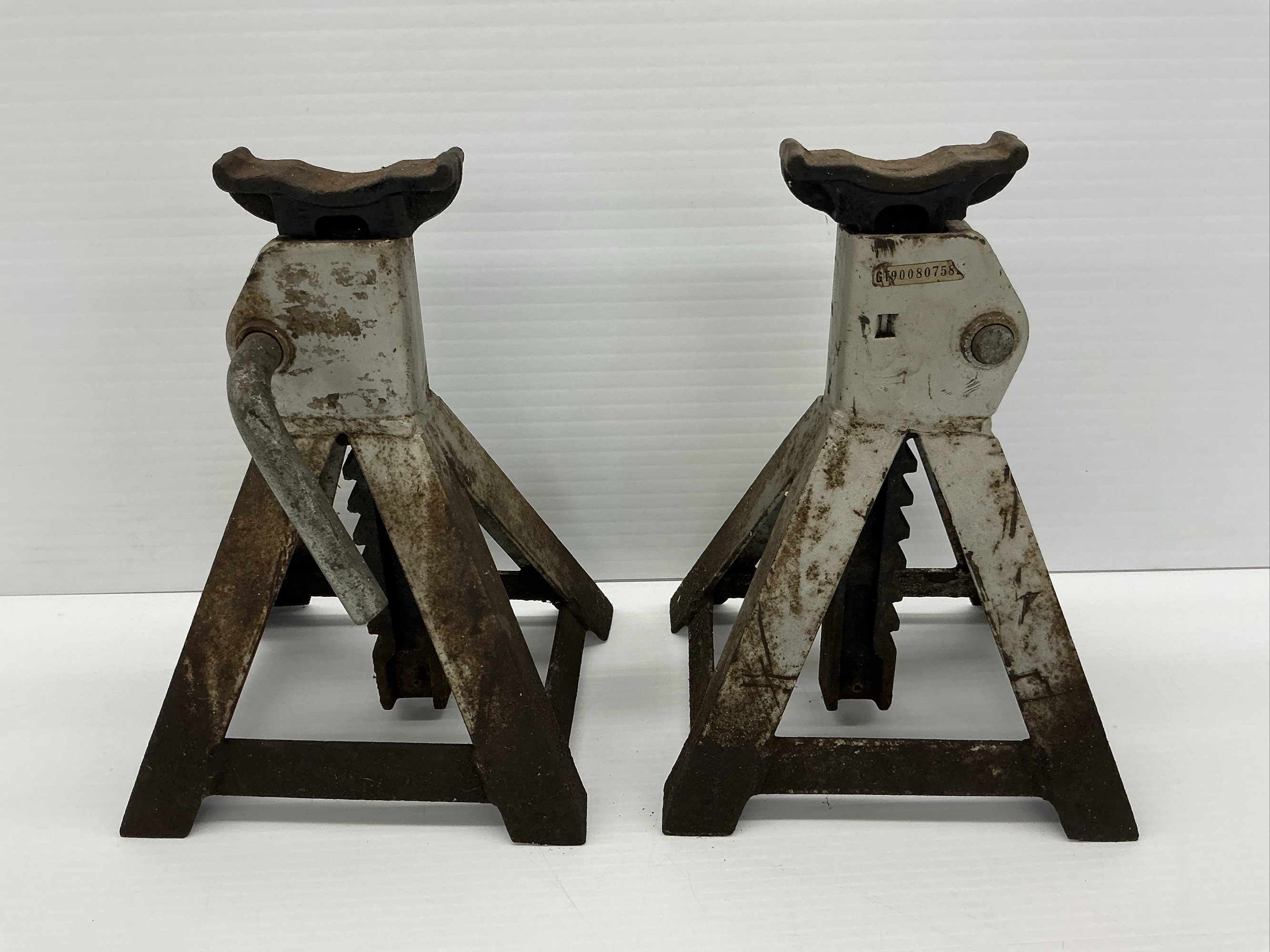 Offered is a pair of metal vehicle jack stands. Please see photos for details. 11 in. tall