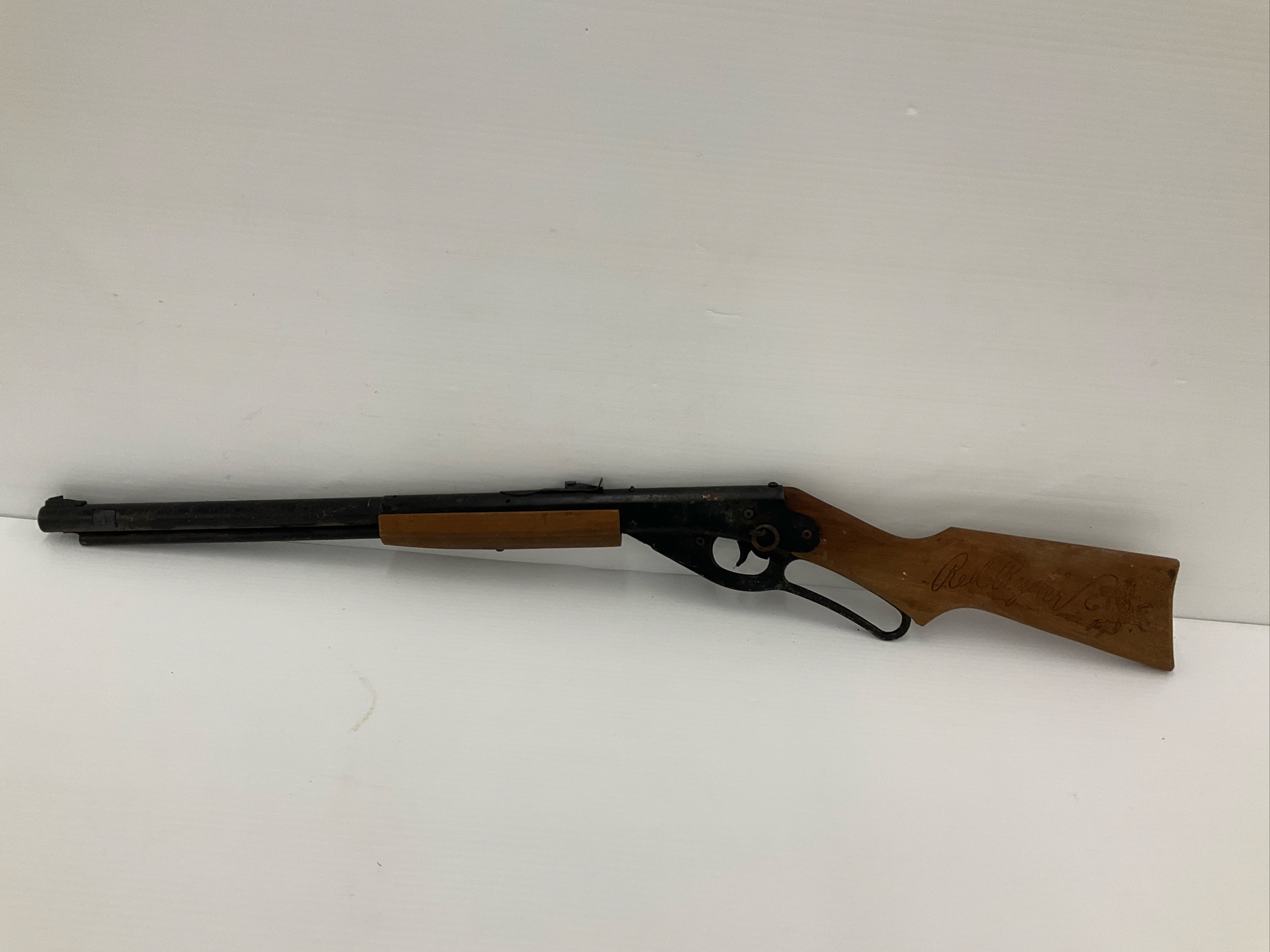 Daisy Red Ryder Model 1938B BB gun manufactured by Daisy MFG. CO., Rogers, Arkansas. Engraved with the 'Red Ryder' logo on the wooden stock. 36 in. long