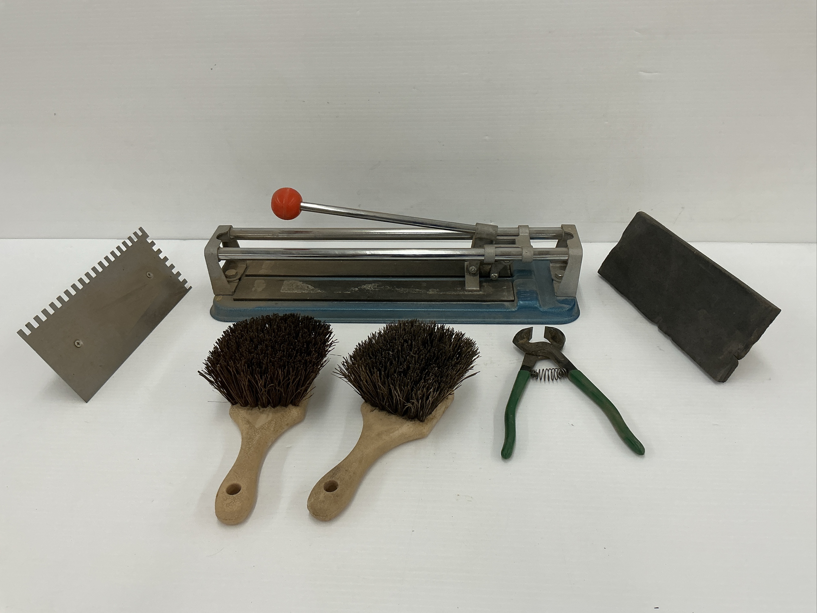 Lot includes a tile cutter, two scrub brushes, tile nippers, and two trowels for ceramic floor tiles. All items appear to be used.