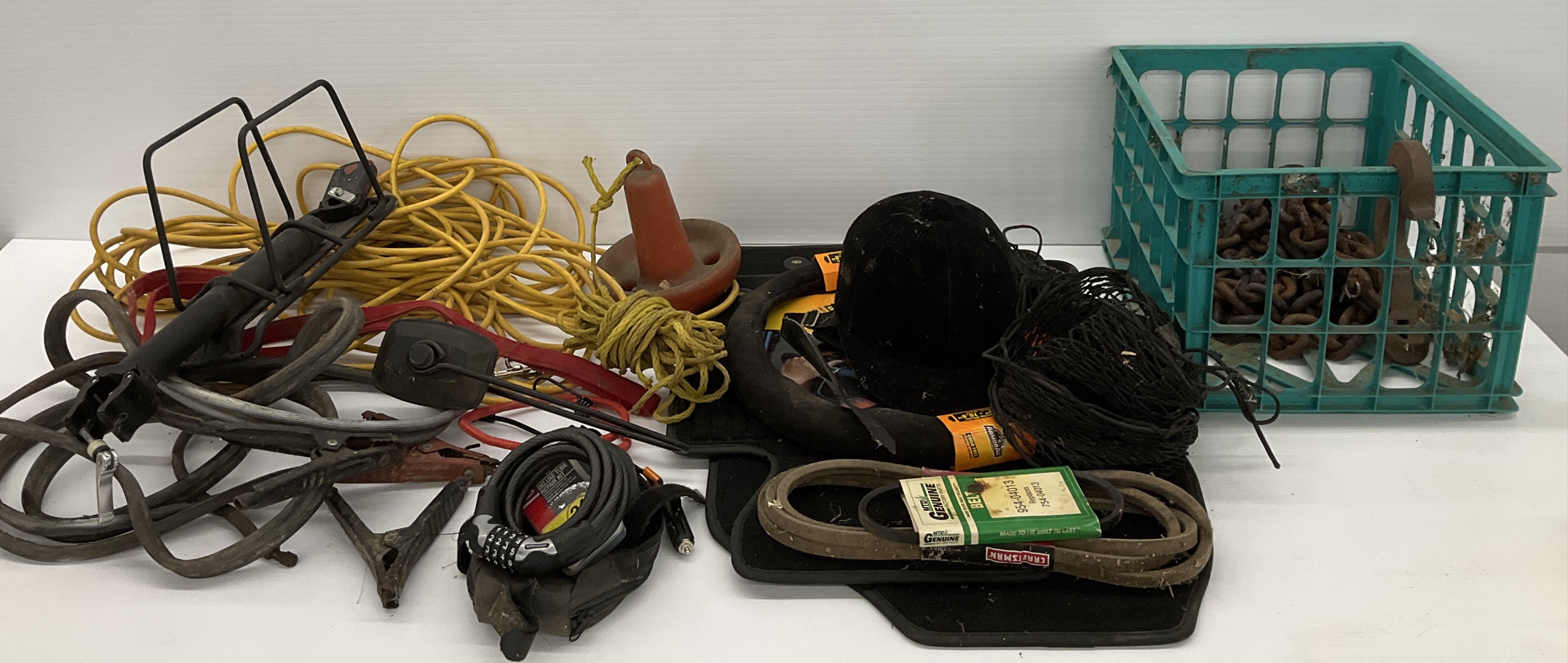 This lot includes a variety of items such as a Bell bicycle tire repair kit, a Kryptonite bicycle lock, a boat anchor, transport chain, Griffith horse rider's hat size 7-1/4, electrical cords, jumper cables (damaged), a dog leash, various belts, an MTD 954-04013 lawn mower belt, vehicle floor mats, Craftsman tractor belt, heated steering wheel cover and more. See photos for details.