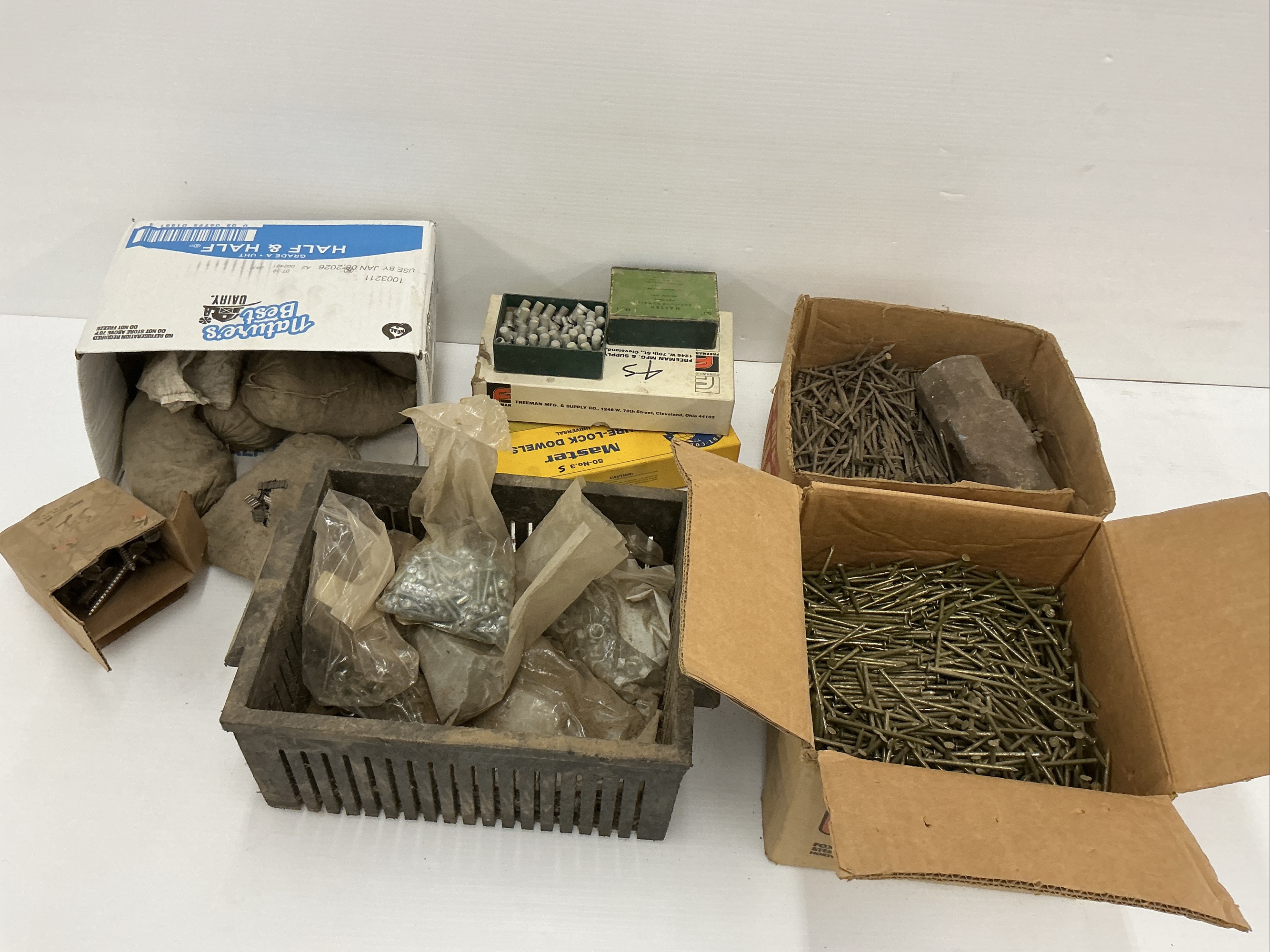 This lot includes a variety of fasteners such as nails, screws, bolts, washers and dowels. There are multiple boxes and bags filled with a range of sizes and types. See photos for the items included.