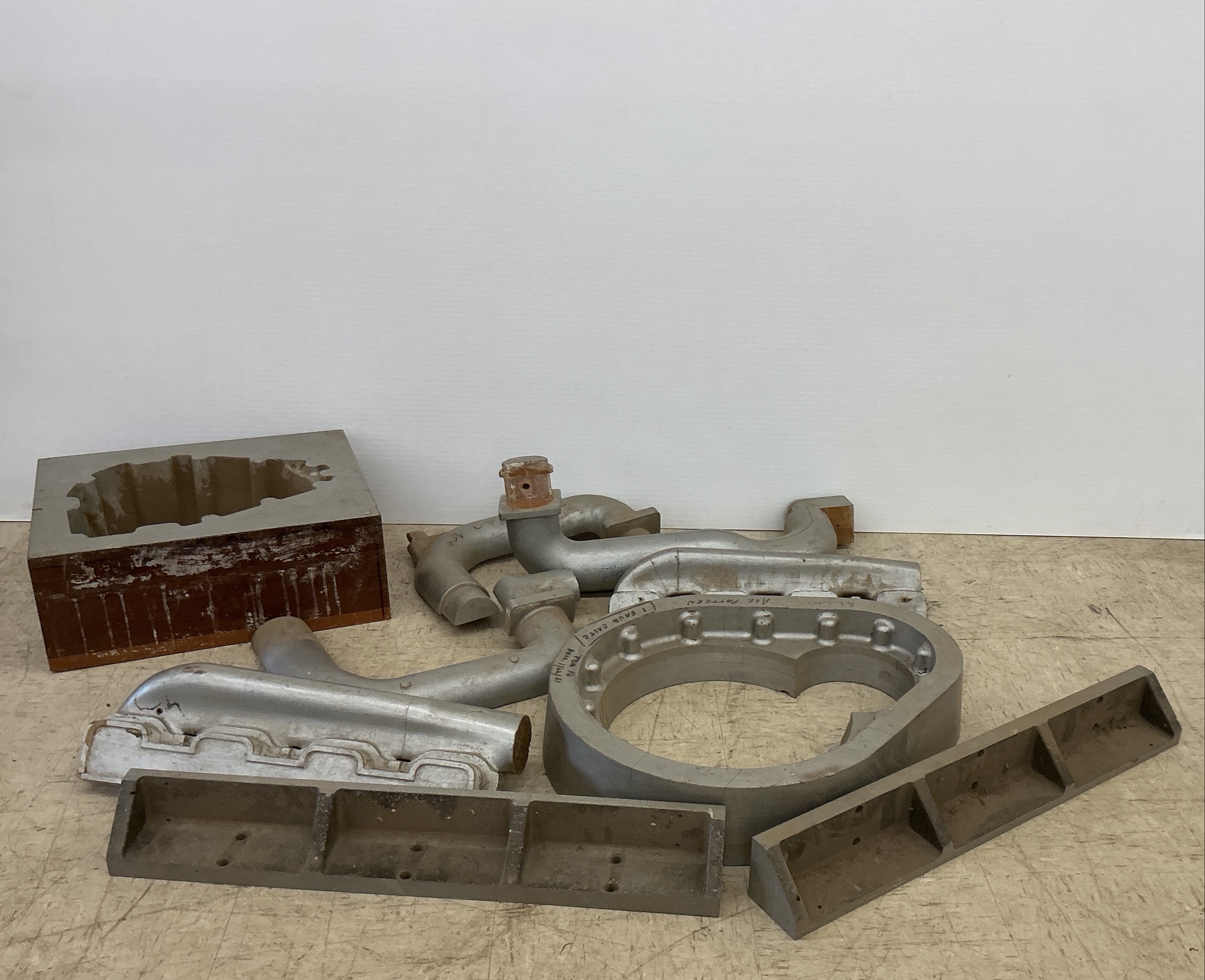 A collection of various molds and cores used for foundry casting processes. The lot includes sand molds and core forms used to create castings. Largest 29 in. across.