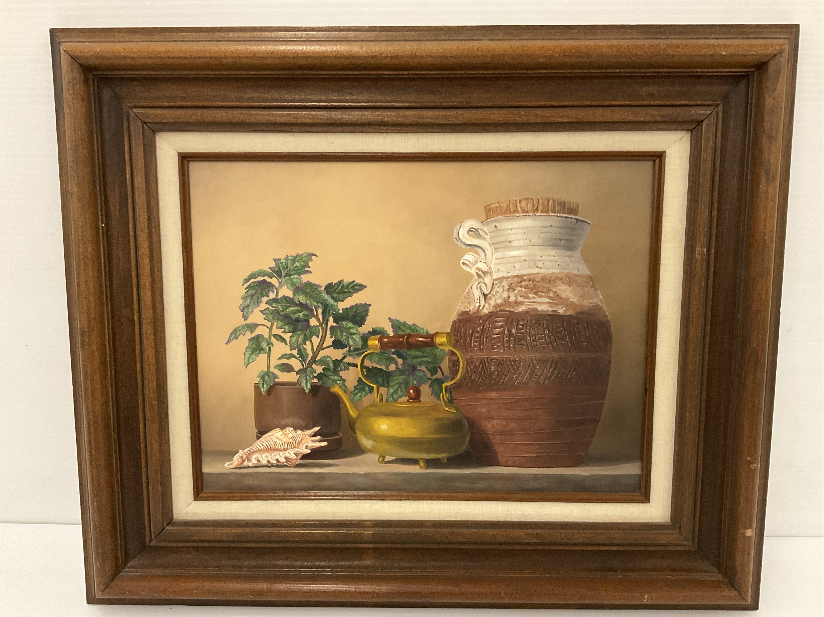 Original framed oil painting by Prible. The subject is a still life featuring a plant, kettle, and vase. The painting is titled "Earthtones and Green" and measures 20 x 24 in. in its frame.
