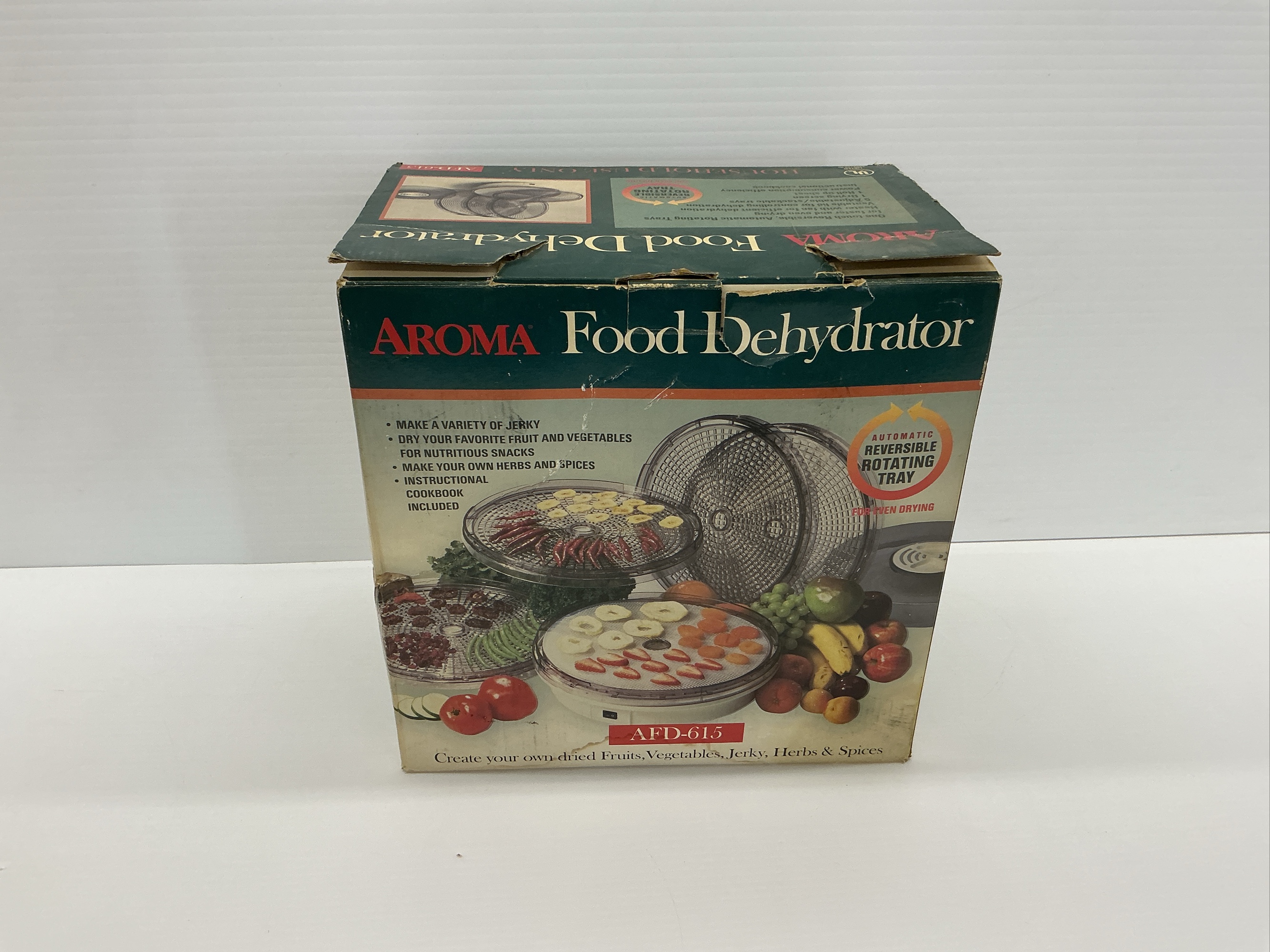 Aroma AFD-615 Food Dehydrator with Automatic Reversible Rotating Trays, includes instruction manual. 14 x 13.5 x 9 in.