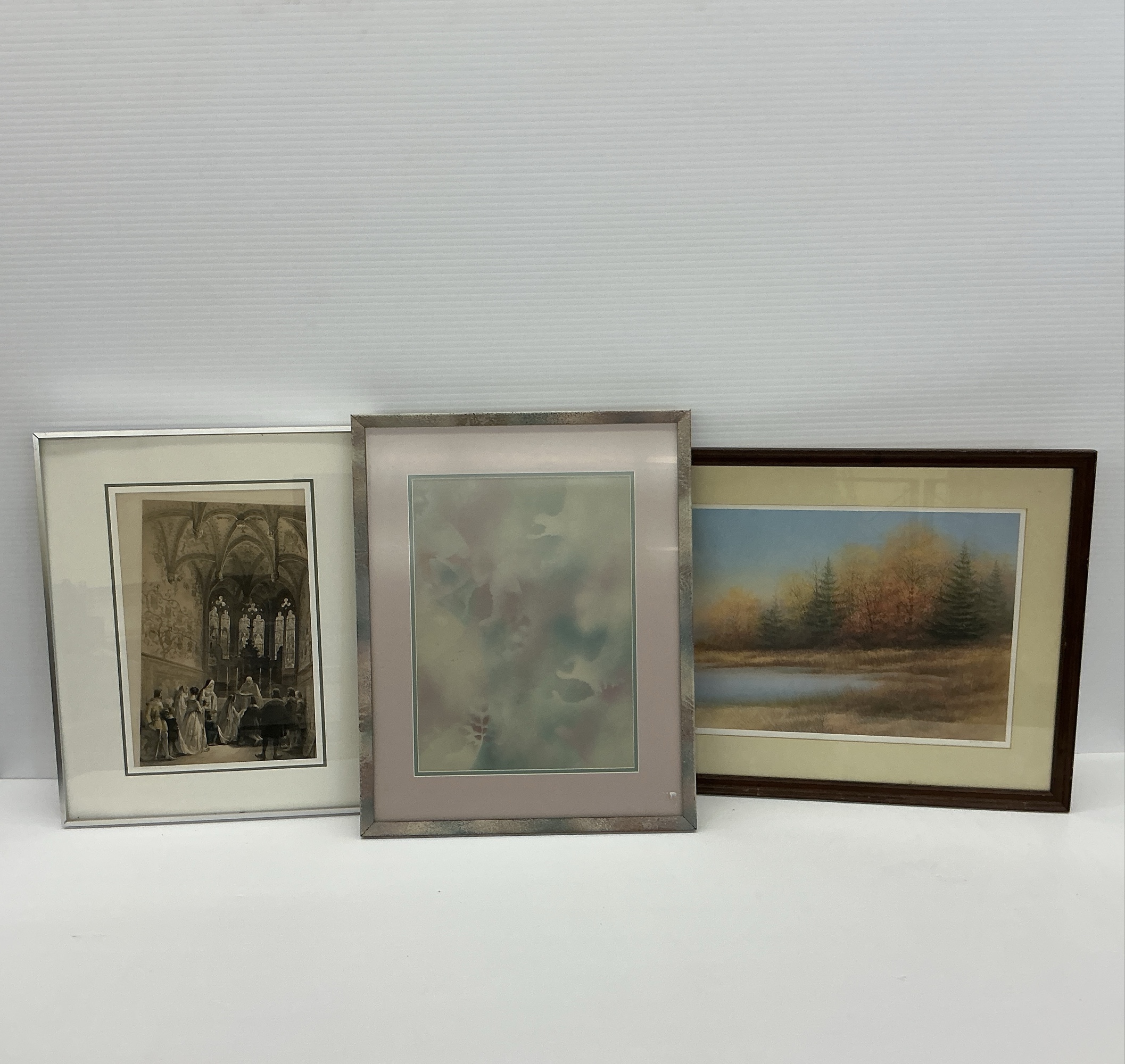This lot features three framed prints. The first is an abstract style piece with a textured frame. The second is a signed limited edition print by artist Arnold Alaniz, numbered 157/950. The third print depicts a cathedral and is loose in frame. Largest 22 x 26.5 in.