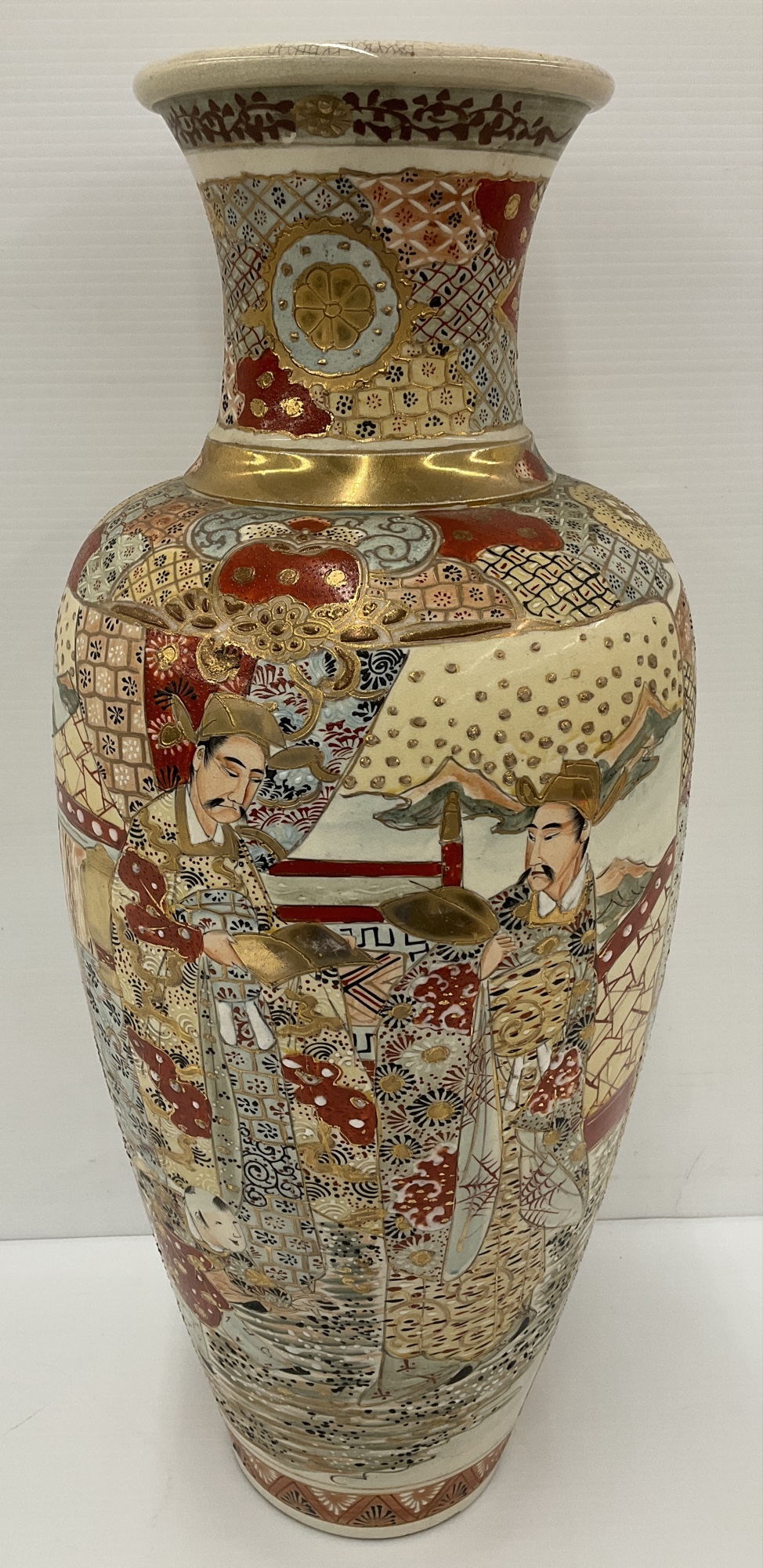 Elaborately decorated vase with scenes of figures in traditional attire and patterns. 25 in. tall