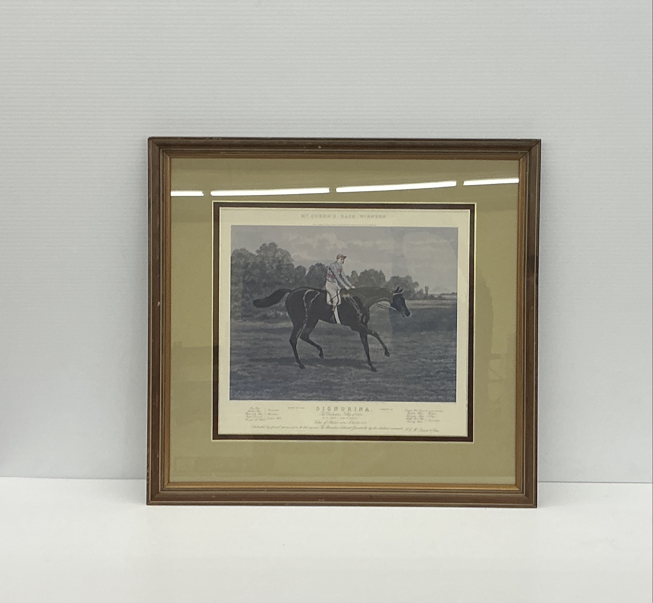 Framed McQueen's Race Winners print featuring the horse, Signorina. The print showcases race information and details about the horse and includes the races Signorina won. 33 x 35 in.