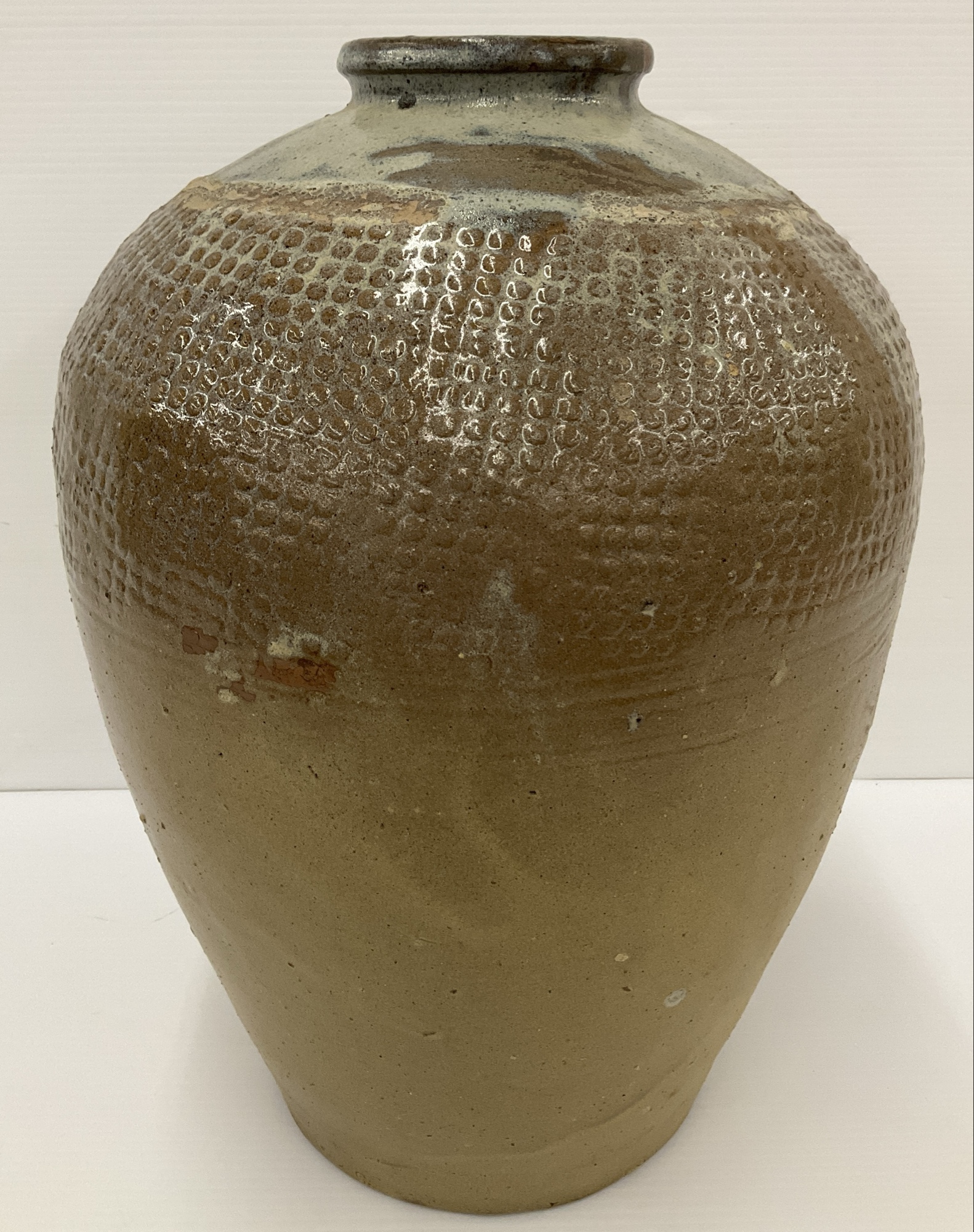 Large pottery vase with a textured upper portion and a glazed finish. 20 in. tall