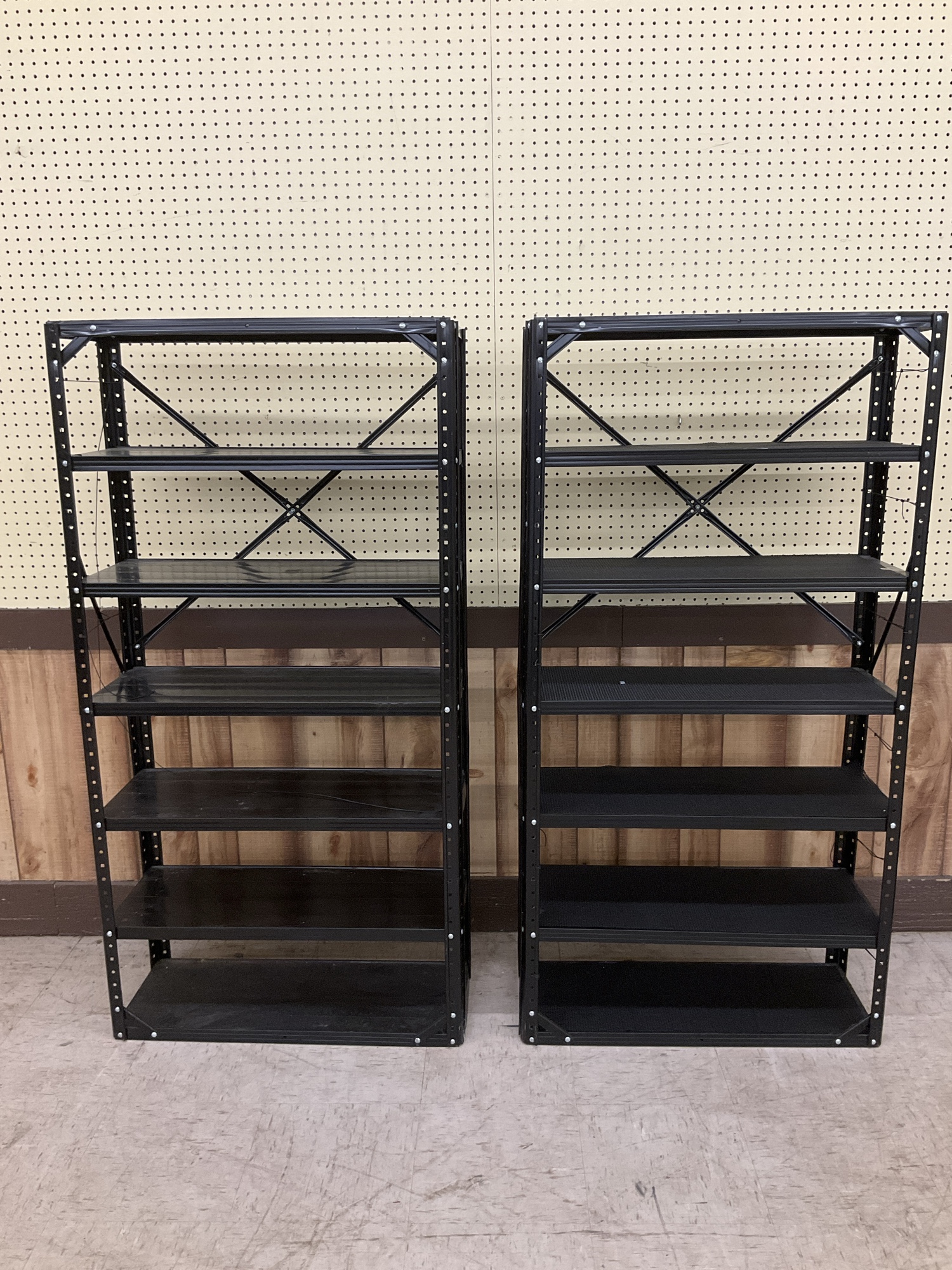 Two sturdy industrial style storage shelving units. The shelves appear to be made of a metal material and are ready to be used. 58.5 x 30 x 11.5 in.