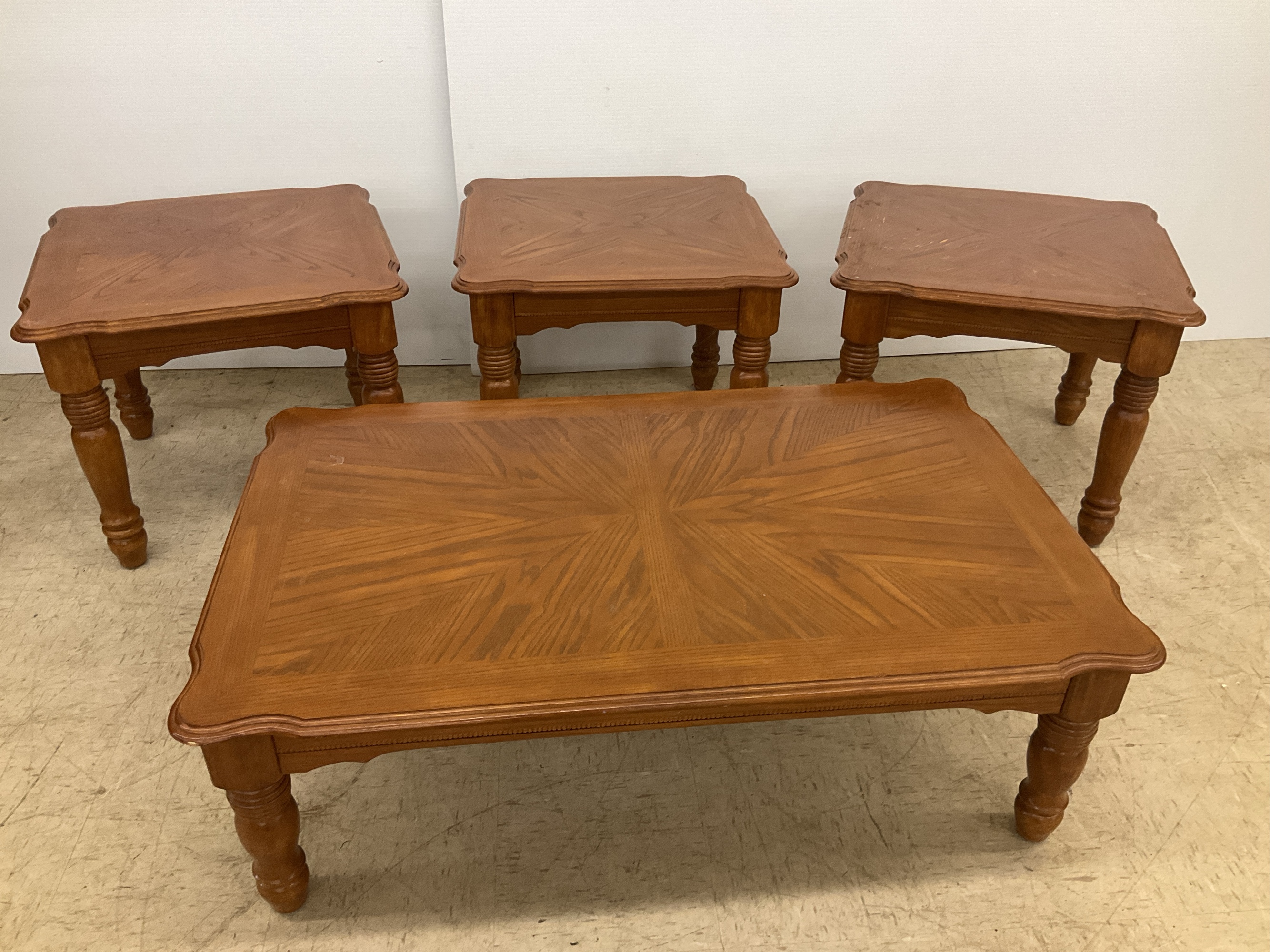 Set includes a rectangular coffee table and three square end tables, all constructed from wood with a light brown finish. The tables feature decorative wood grain patterns on the top surface and turned legs. Coffee table 16 x 48 x 29 in., end table 22 x 25 x 25 in.